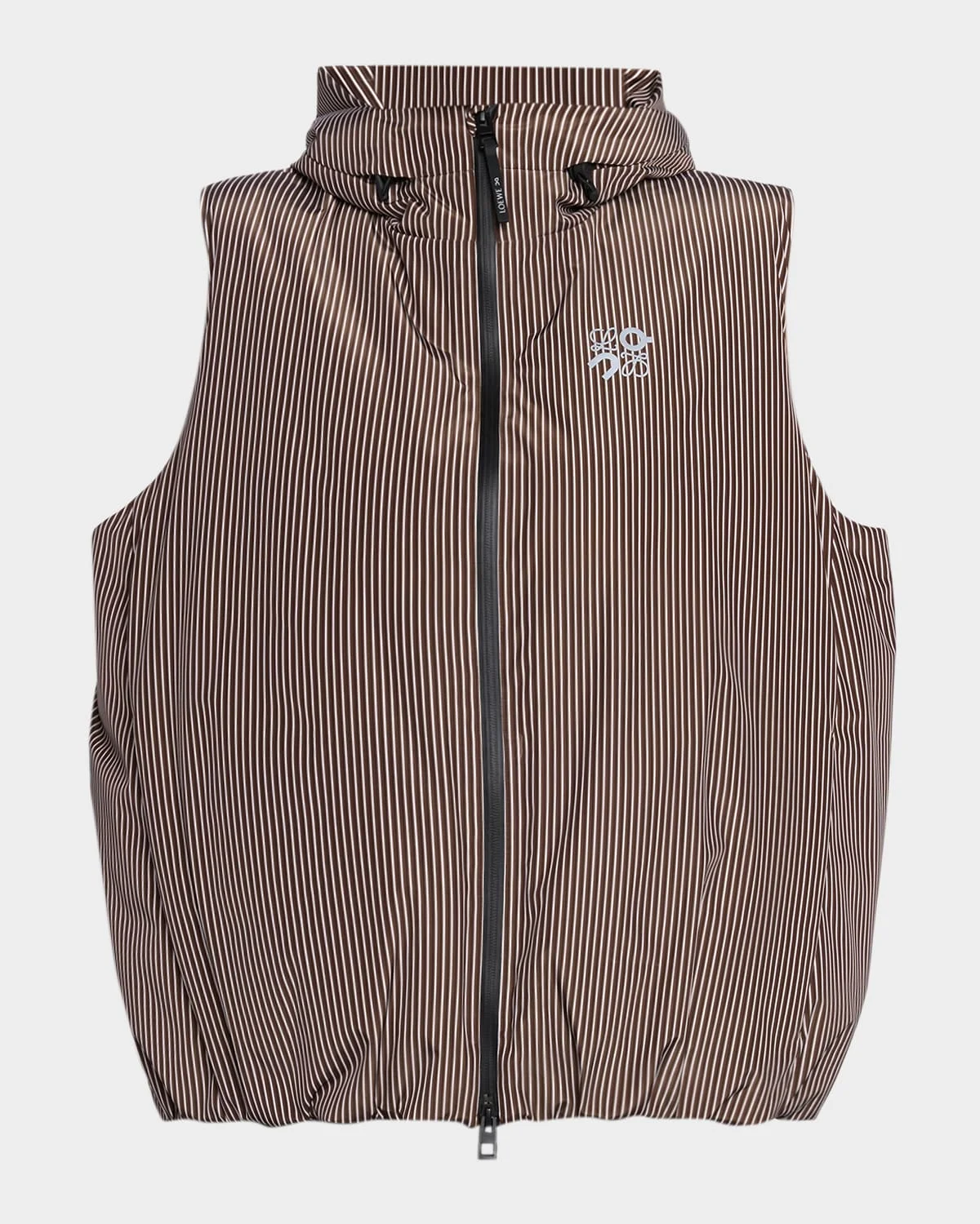 Loewe insulated, waterresistant puffer vest boasts padded construction with a digital stripe print. Designed in collaboration with On Toggle drawstring hood Sleeveless Reflective Anagram On print placed on the chest and back Zip side seam pockets Interior mesh pockets Elasticized drawstring hem Regular fit Twoway zip front closure Polyester/nylon/polyamide/polyurethane Professional cleaning recommended Imported