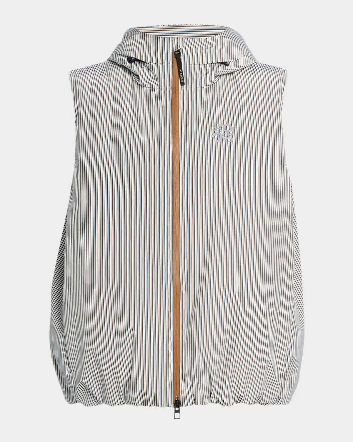 Loewe insulated, waterresistant puffer vest boasts padded construction with a digital stripe print. Designed in collaboration with On Toggle drawstring hood Sleeveless Reflective Anagram On print placed on the chest and back Zip side seam pockets Interior mesh pockets Elasticized drawstring hem Regular fit Twoway zip front closure Polyester/nylon/polyamide/polyurethane Professional cleaning recommended Imported