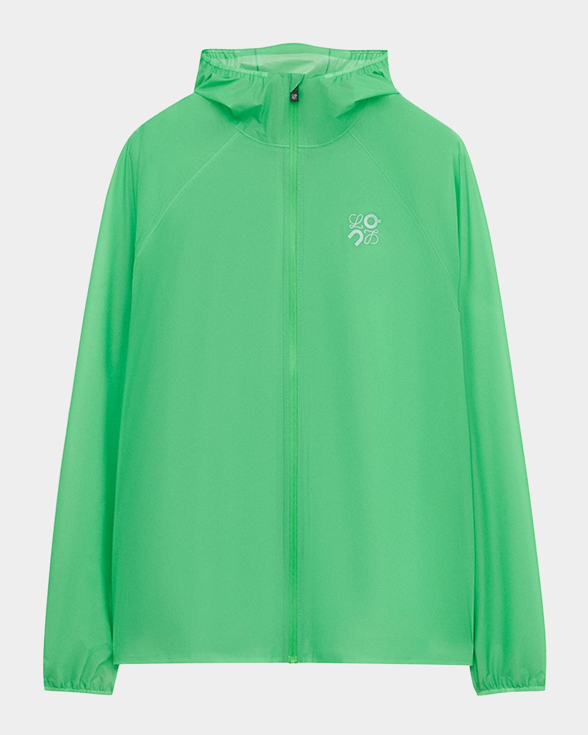 - Loewe "Ultra" jacket crafted in ultra-lightweight ripstop shell offering high performance standards of water repellency and windproofness. The perfect hiking and travel companion as it packs down into a pouch in the hood. - Made in collaboration with On - Elastic hooded neckline; waterproof two-way zip front - Long raglan sleeves - Reflective Anagram printed chest - Reflective LOEWE x On logo printed back - Waterproof zip rear pocket - Sealed seams - Straight fit - Hip length - Elasticized cuffs and hem - Nylon/polyamide/elastane - Professional cleaning recommended - Imported