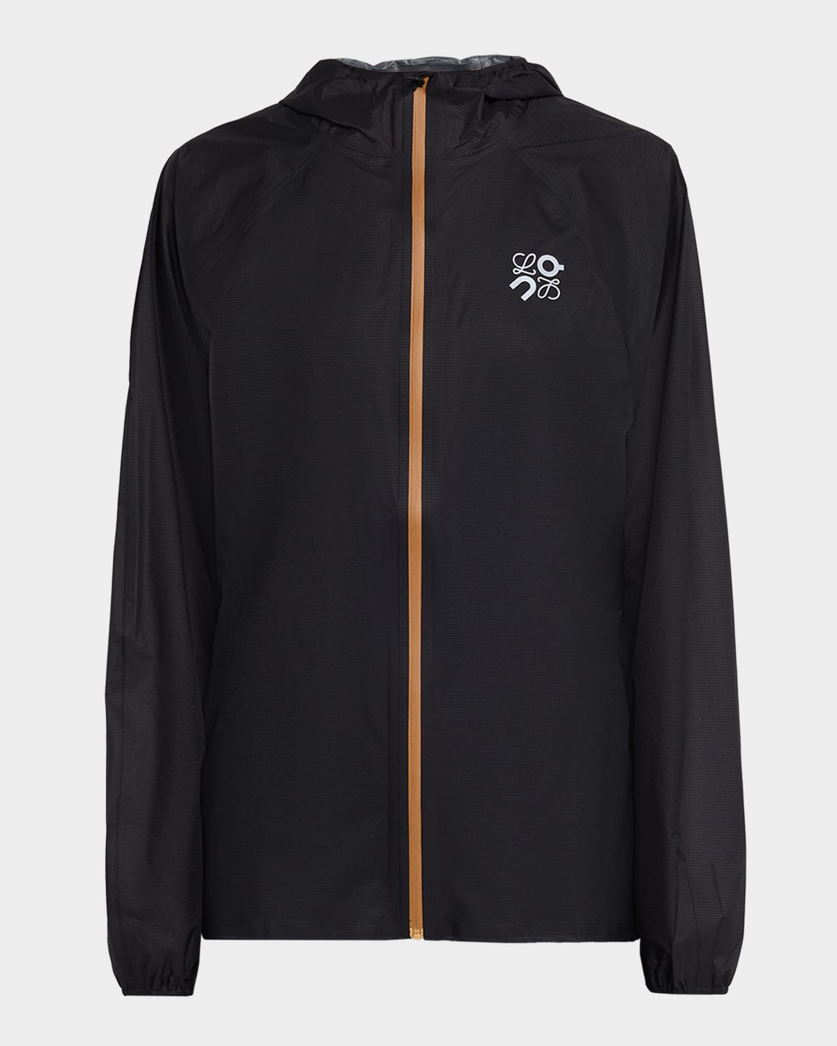 Loewe "Ultra" jacket crafted in ultralightweight ripstop shell offering high performance standards of water repellency and windproofness. The perfect hiking and travel companion as it packs down into a pouch in the hood. Made in collaboration with On Elastic hooded neckline; waterproof twoway zip front Long raglan sleeves Reflective Anagram printed chest Reflective LOEWE x On logo printed back Waterproof zip rear pocket Sealed seams Straight fit Hip length Elasticized cuffs and hem Nylon/polyamide/elastane Professional cleaning recommended Imported