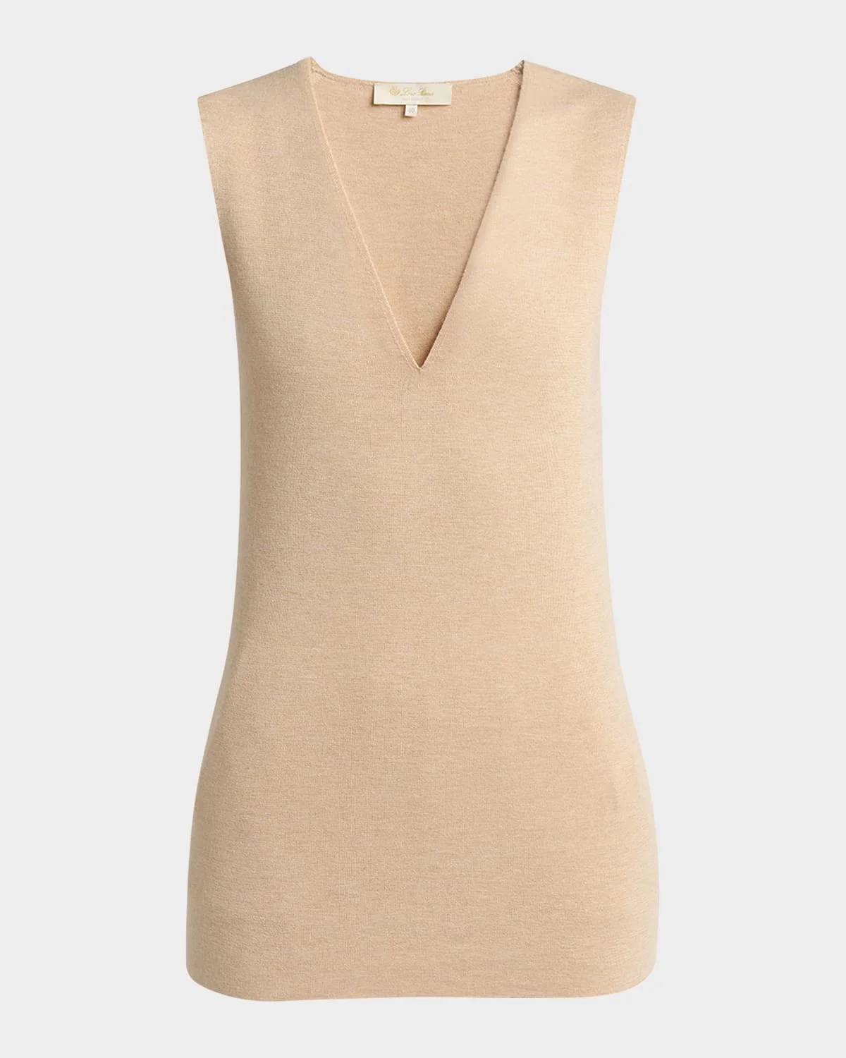 Loro Piana "Cocooning" top in delicate 18gg cashmeresilk knit V neckline Sleeveless Relaxed fit Pullover style Cashmere/silk Made in Italy