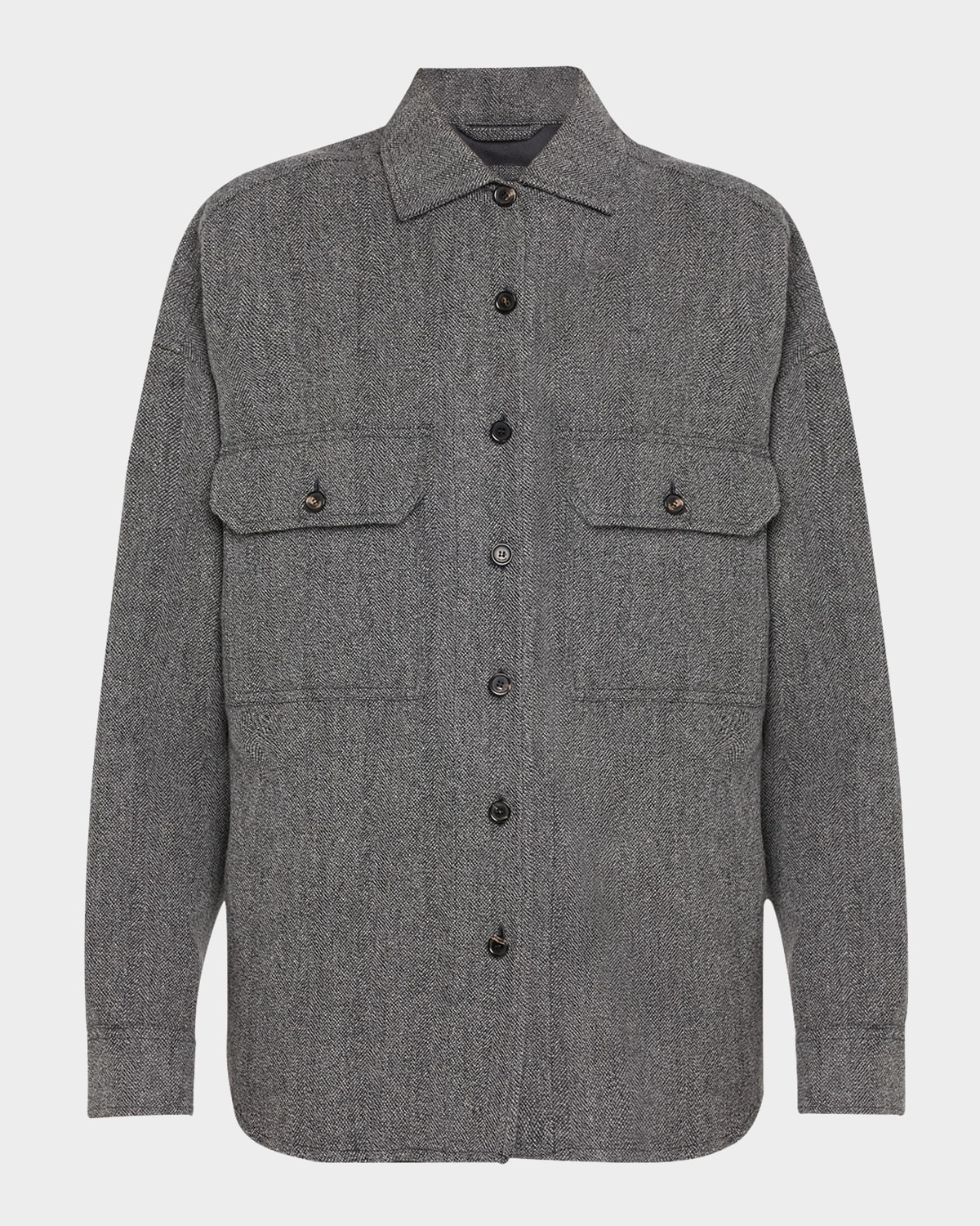 - Loro Piana "Darby" linen-blend overshirt - Spread collar; button front - Long sleeves; button cuffs - Chest flap-buttoned pockets - Straight fit - Back yoke - Linen/virgin wool/cashmere - Made in Italy