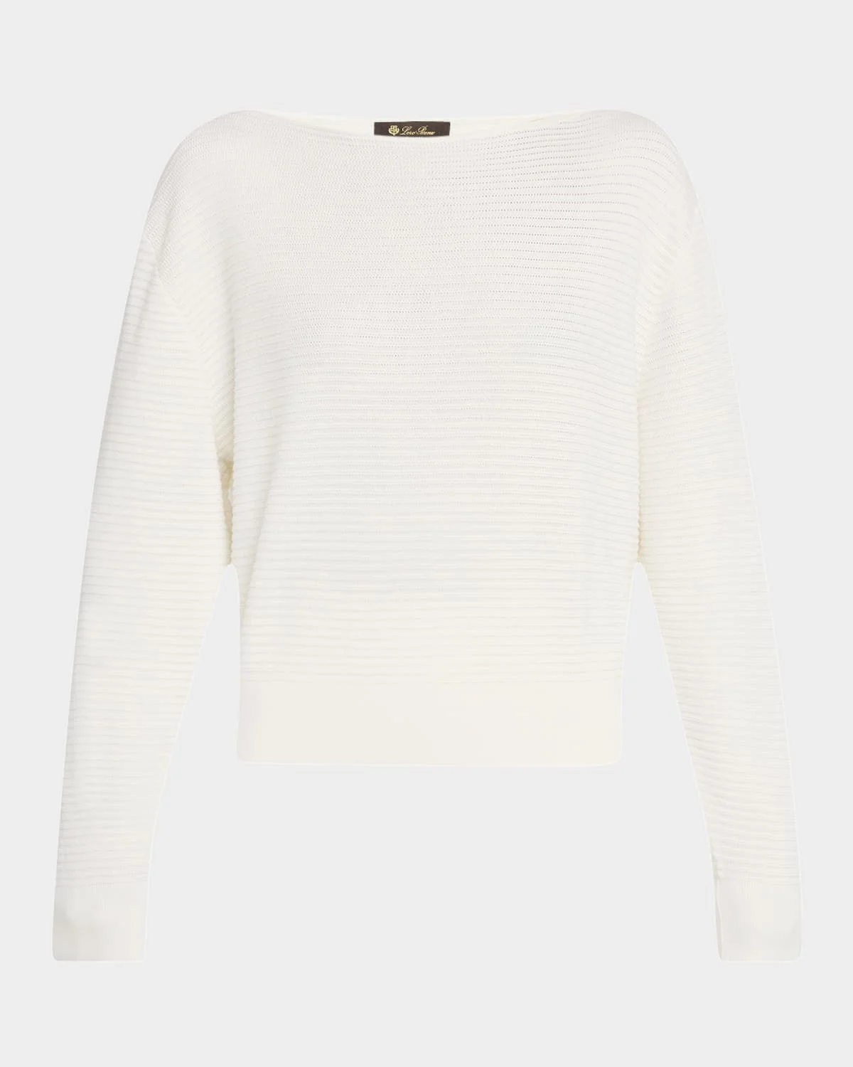 - Loro Piana "Dora Baltea" sweater in 12gg horizontal ribbed knit - Boat neckline - Long sleeves - Relaxed fit - Banded cuffs and hem - Pullover style - Silk/cotton - Made in Italy