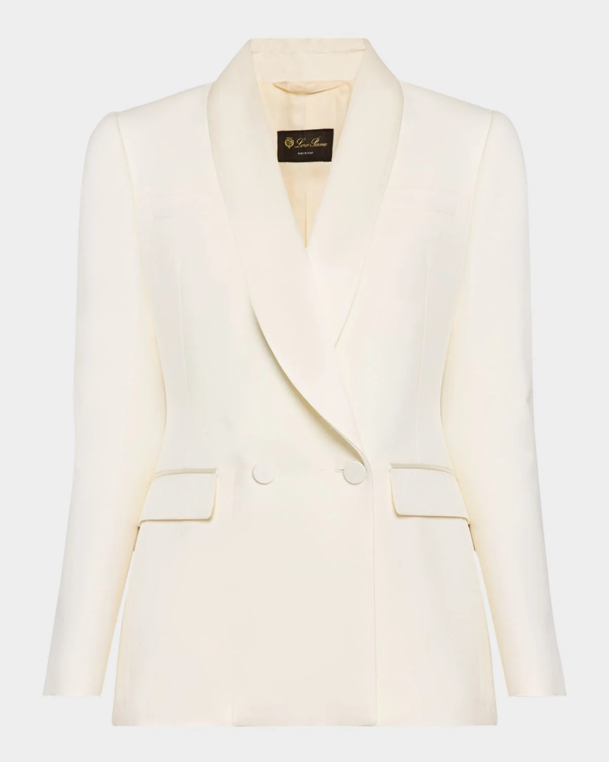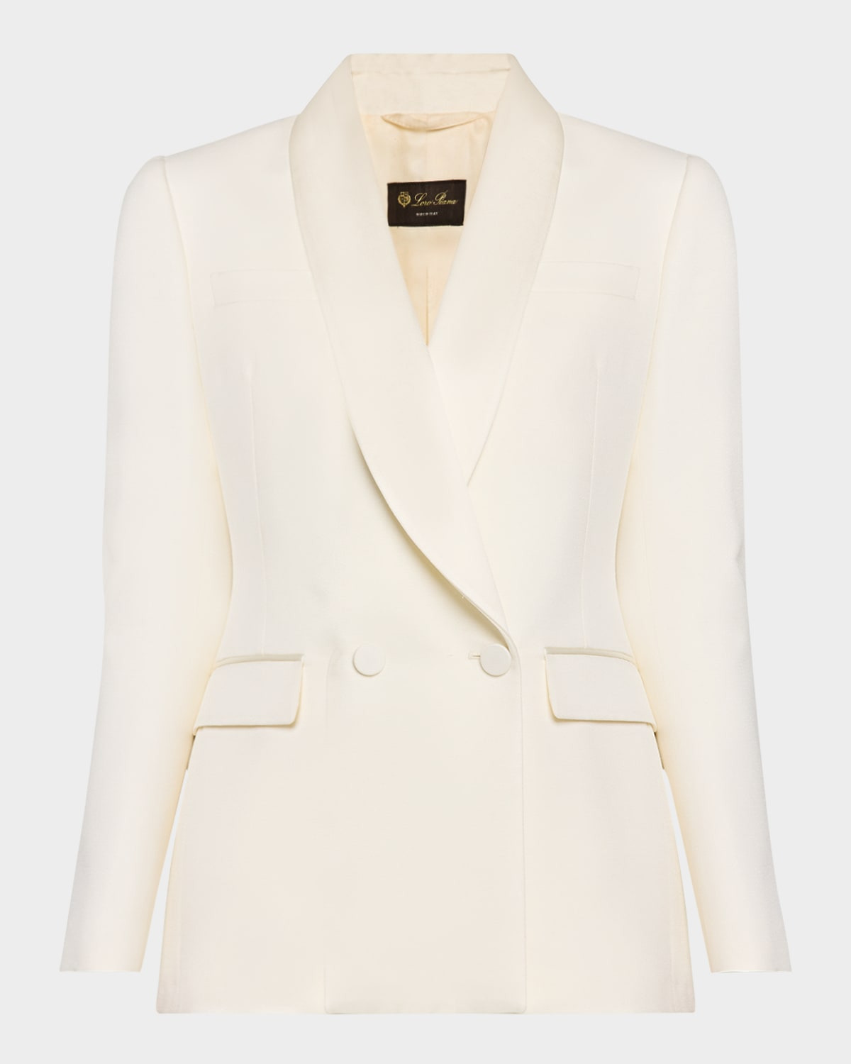 Loro Piana "Doreen" jacket Shawl collar; doublebreasted Long sleeves; button cuffs Chest welt pocket; waist flap pockets Straight fit Back walking slit Virgin wool/silk Silk lining Dry clean Made in Italy