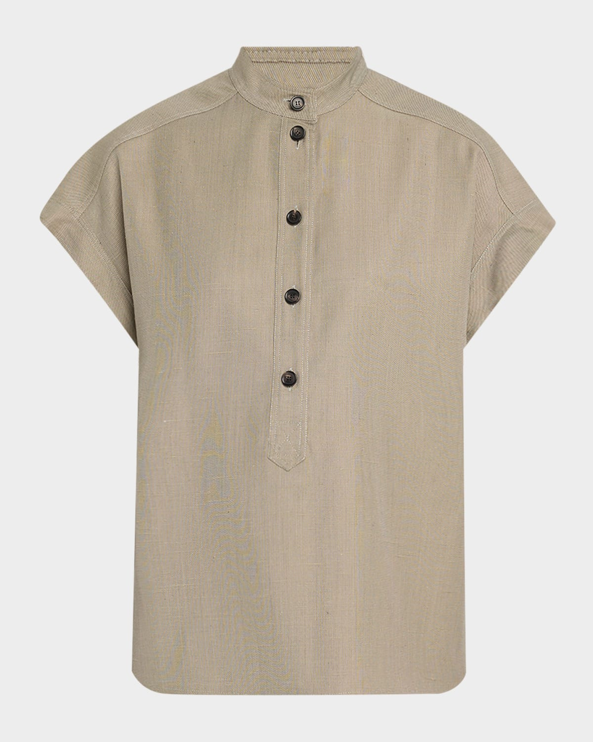 - Loro Piana "Elody" shirt in a silk blend - Band collar; half-button front - Cap sleeves - Relaxed fit - Pullover style - Silk/virgin wool - Dry clean - Made in Italy