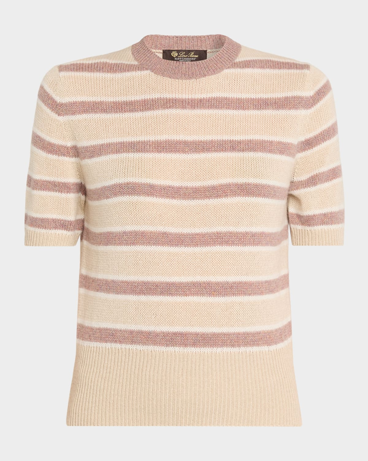 Knit from luxurious Mongolian baby cashmere, the "Fobello" sweater by Loro Piana is patterned with twotone horizontal stripes and framed with ribbed trim for a neat finish 7GG Contrasting crew neckline Short sleeves Hip length Pullover style Cashmere Made in Italy