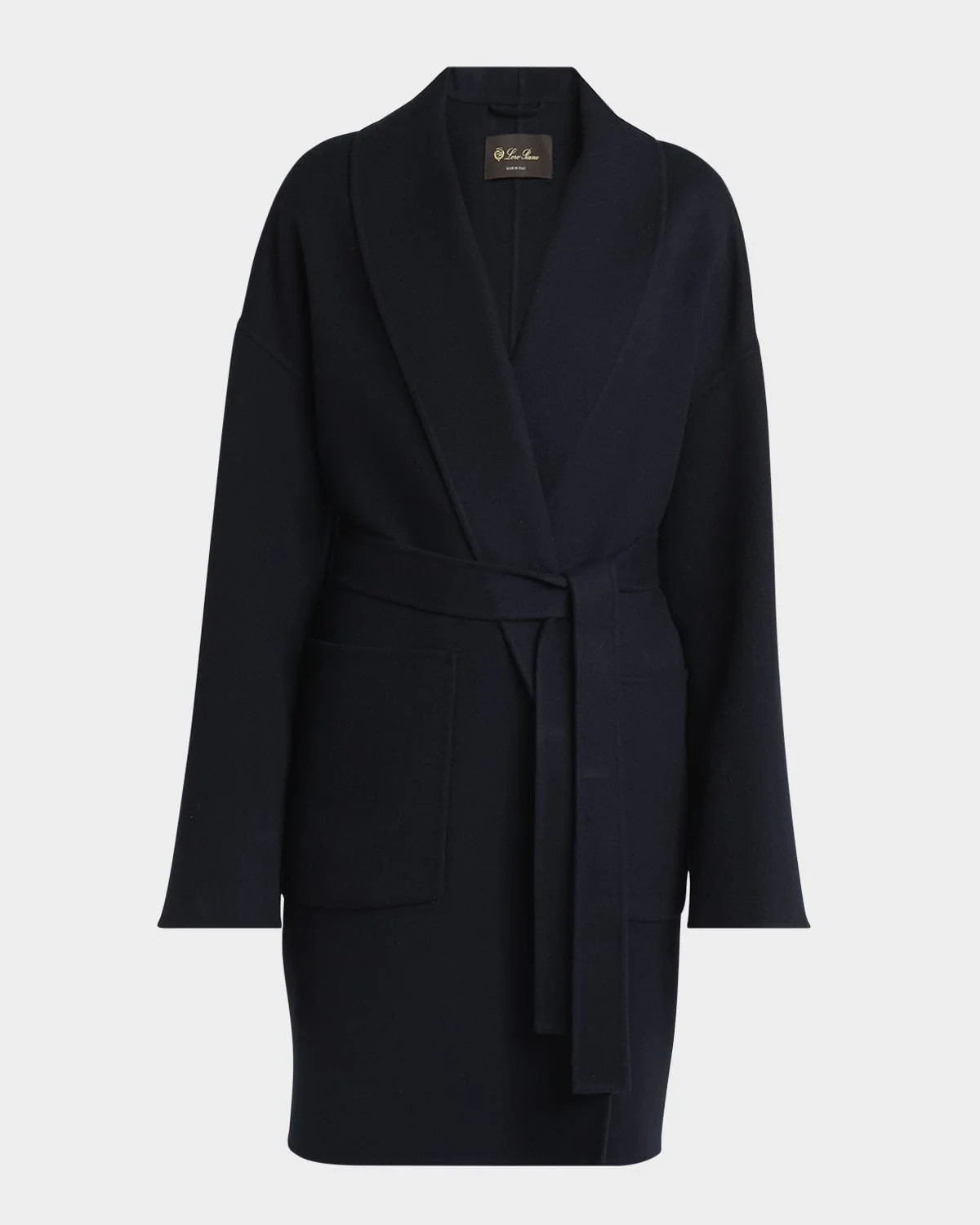 Loro Piana "Jed" coat in double brushed cashmere Shawl collar; singlebreasted front Long sleeves Selftie belted waist Side patch pockets Straight fit Hem falls below the hip Cashmere Made in Italy