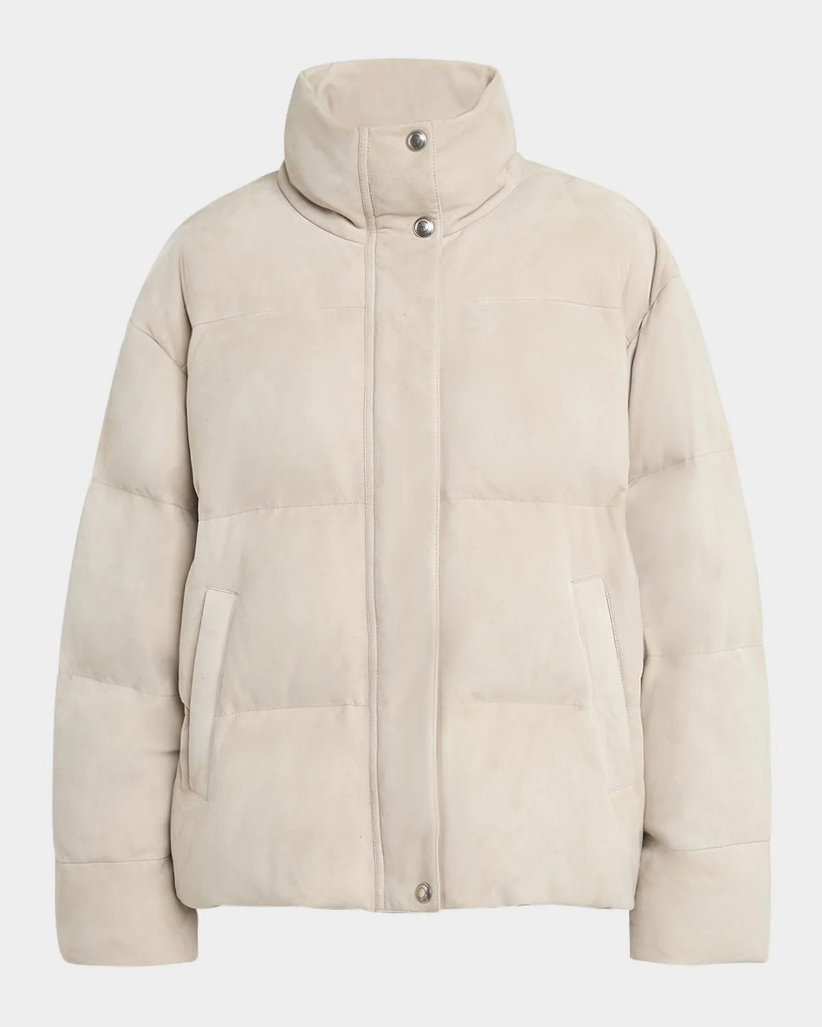 Loro Piana "Jools" puffer jacket in soft techno suede Stand collar; concealed twoway zip front Long sleeves Side welt pockets Straight fit Leather Lining: Suede/virgin wool/goat leather Fill: Polyfill Made in Italy