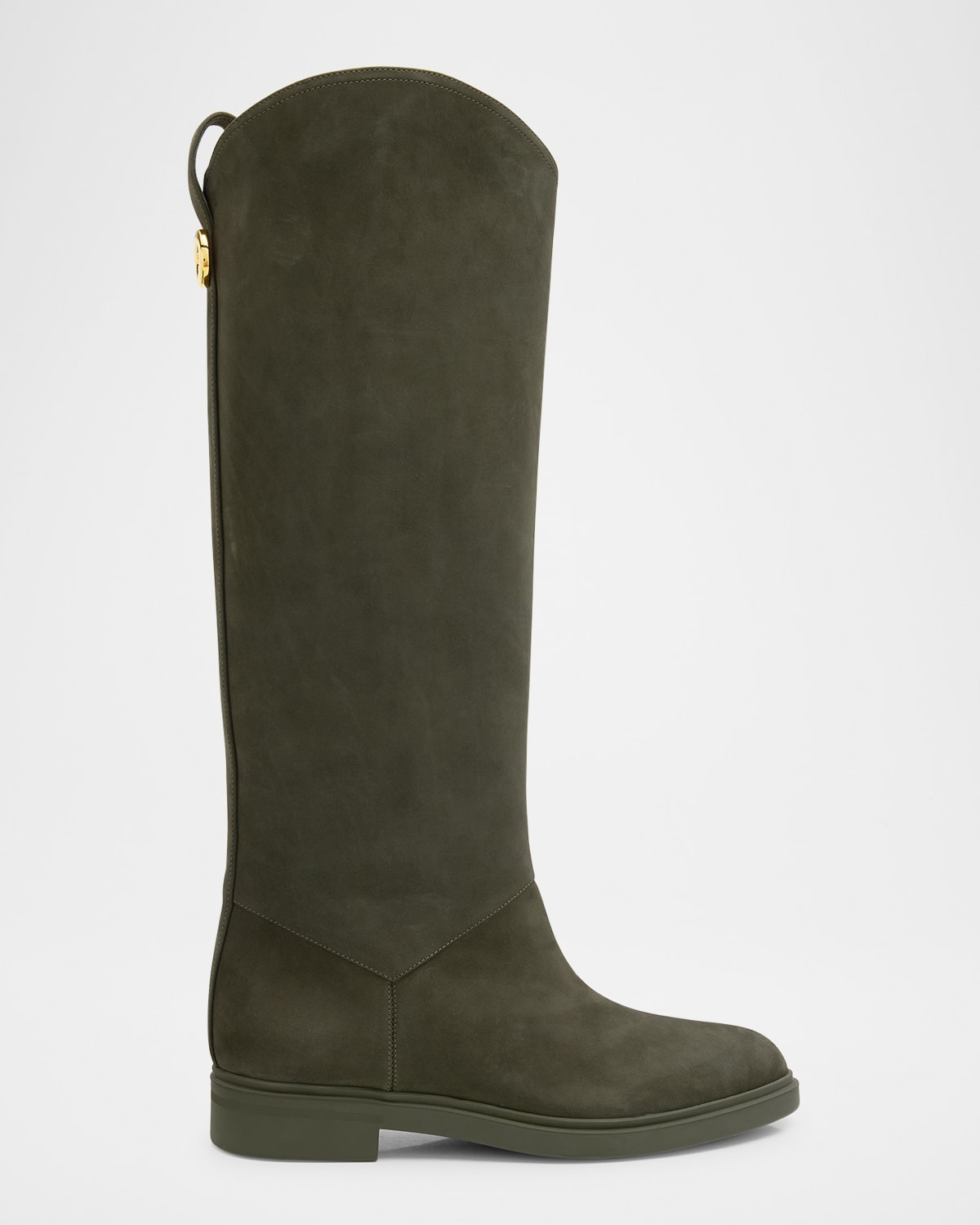 - Boasting a classic equestrian-style silhouette, the "Kilda" knee-high boots by Loro Piana are crafted from supple calf suede with a - 0.75 in / 20 mm stacked flat heel - Round toe - Pull-tab with logo-engraved golden back detail - Pull-on style - Leather lining - Tonal non-slip rubber outsole - Wipe clean - Made in Italy