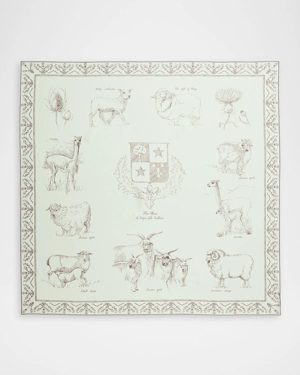 Loro Piana foulard & nbsp;features a print celebrating the house & apos;s heritage, depicting iconic elements related to the brand & apos;s origins Approx. 35.43"Sq. Hand-rolled edges May be styled multiple ways Silk Dry clean Made in Italy