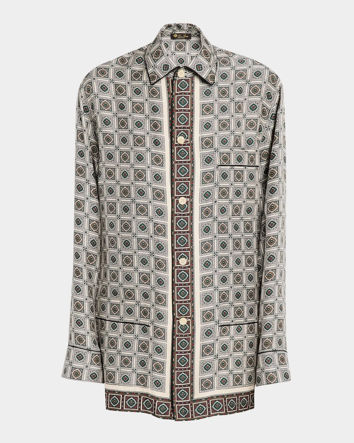 - Crafted in silk twill, the "Lian" shirt from Loro Piana is emblazoned with the Loro Piana Mendoza Border print, floral tile print, and contrast piping - Complete with mother-of-pearl buttons - Spread collar - Button front - Long sleeves - Front patch pockets - Relaxed fit - Silk - Made in Italy