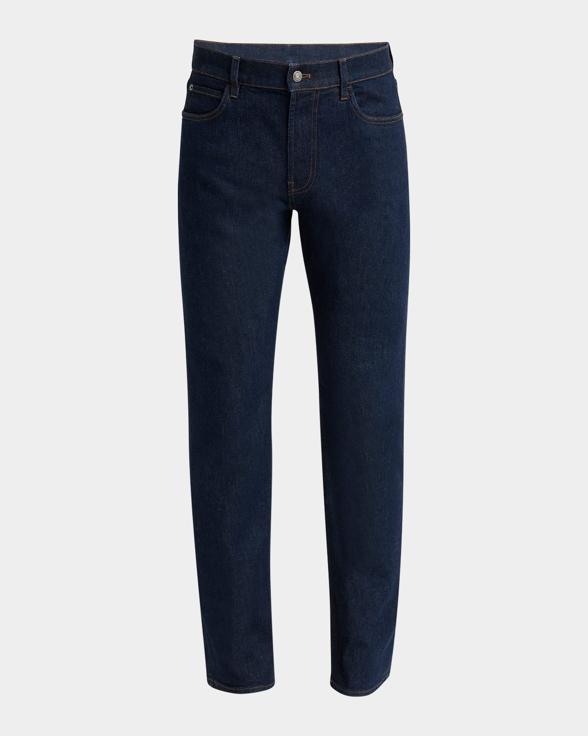 - Loro Piana "Quarona Kurashiki" trousers in dark wash denim - Regular rise - Five-pocket style - Full length - Slim legs - Button/zip fly; belt loops - Cotton/polyurethane - Dry clean - Trim: Leather - Made in Italy - Model is 6'1"/185cm.