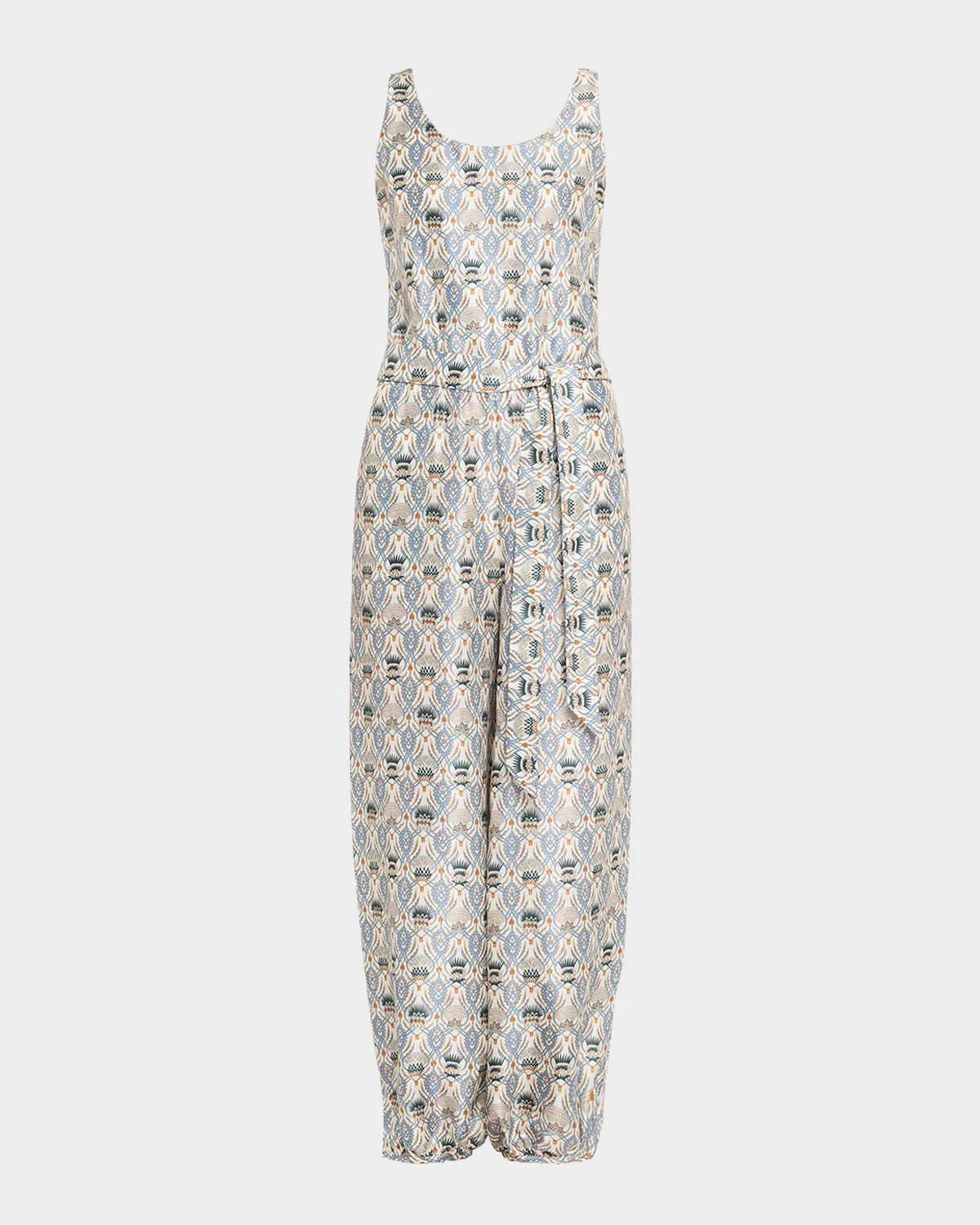 - Loro Piana "Nadia" lightweight silk shantung jumpsuit features the Cardo Veneziano print, a waist sash, and gathered button cuffed hem - Scoop neckline - Sleeveless - Self-tie cinched waist - Side split pockets - Tapered wide legs - Full length - Button cuffs - Pull-on style - Silk - Dry clean - Made in Italy - Proposition 65 warning for California residents