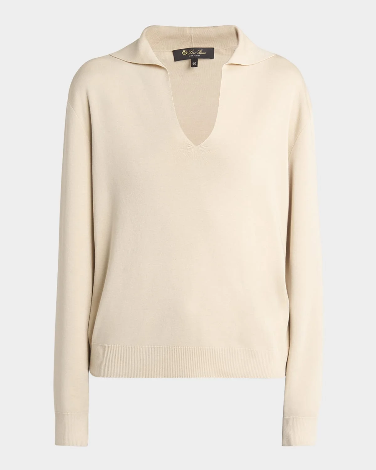 Loro Piana "Sorbonne" silk polo top Shawl collar; v neckline Long sleeves Relaxed fit Hem sits at the hip Pullover style Silk Machine wash Made in Italy