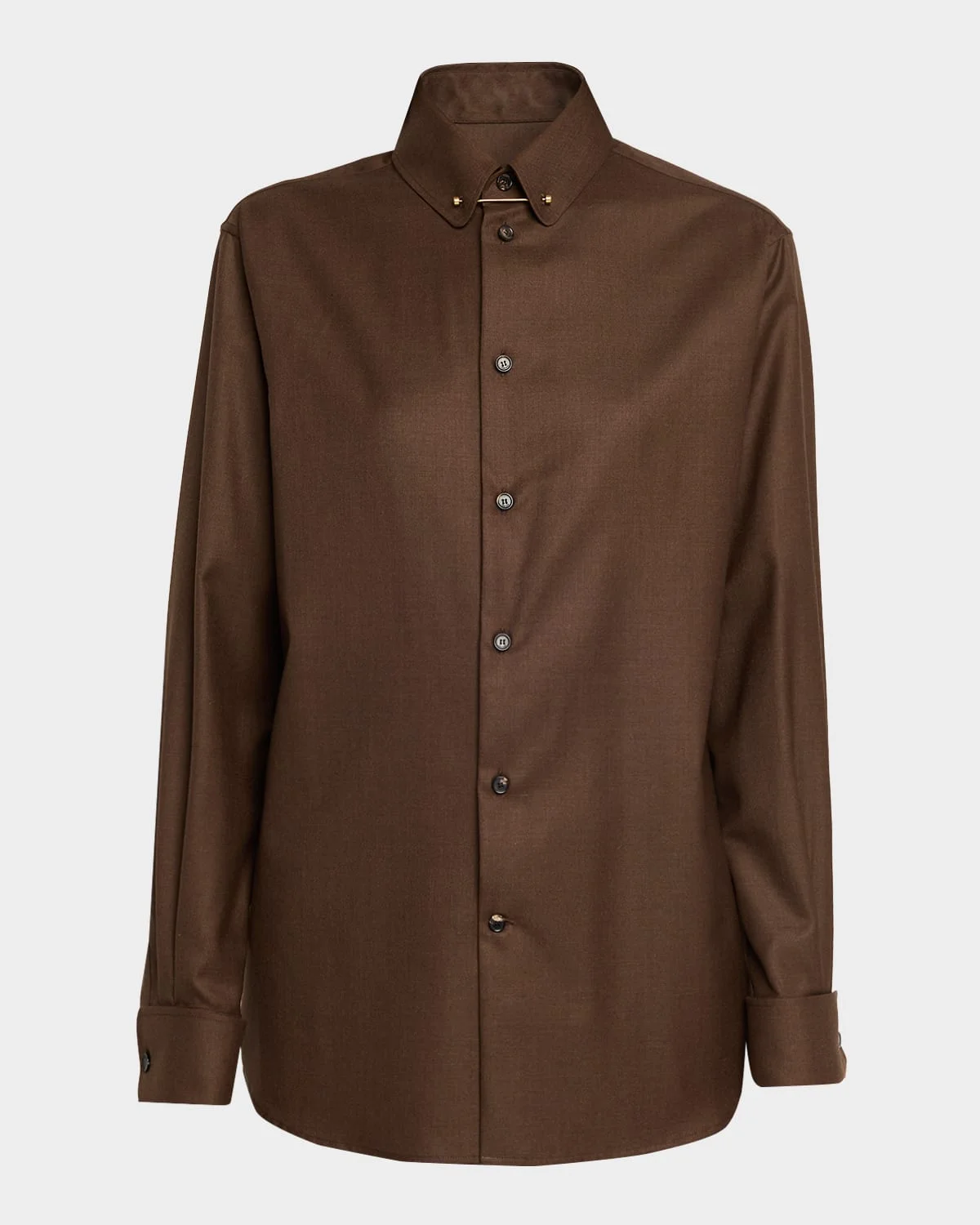 Loro Piana "Thea" shirt elevates classic tailoring with woven wool and a gold-tone collar pin for a polished finish From the 100th anniversary capsule collection Rounded collar; button front Long sleeves; button cuffs Yoked back; box pleat Relaxed fit Shirttail hem Virgin wool Dry clean Made in Italy