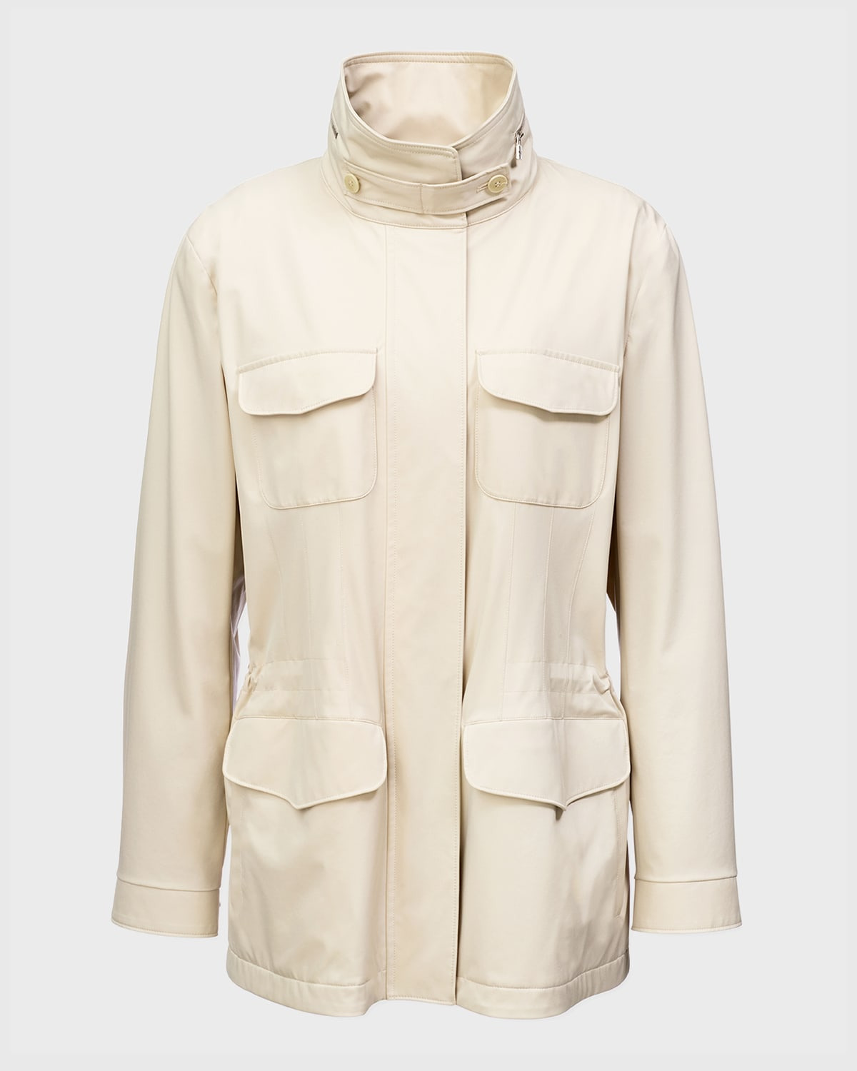 Loro Piana "Traveler" jacket in lightweight, creaseresistant Windmate® microfiber and cashmere blend. Storm System® treatment for a waterproof, windresistant finish. Approx. 26.8"L from shoulder to hem. Spread collar with packable drawstring hood. Zip front with concealed snapover placket. Internal drawstring waist. Four front flap pockets. Nylon; lining, cashmere. Dry clean. Made in Italy.