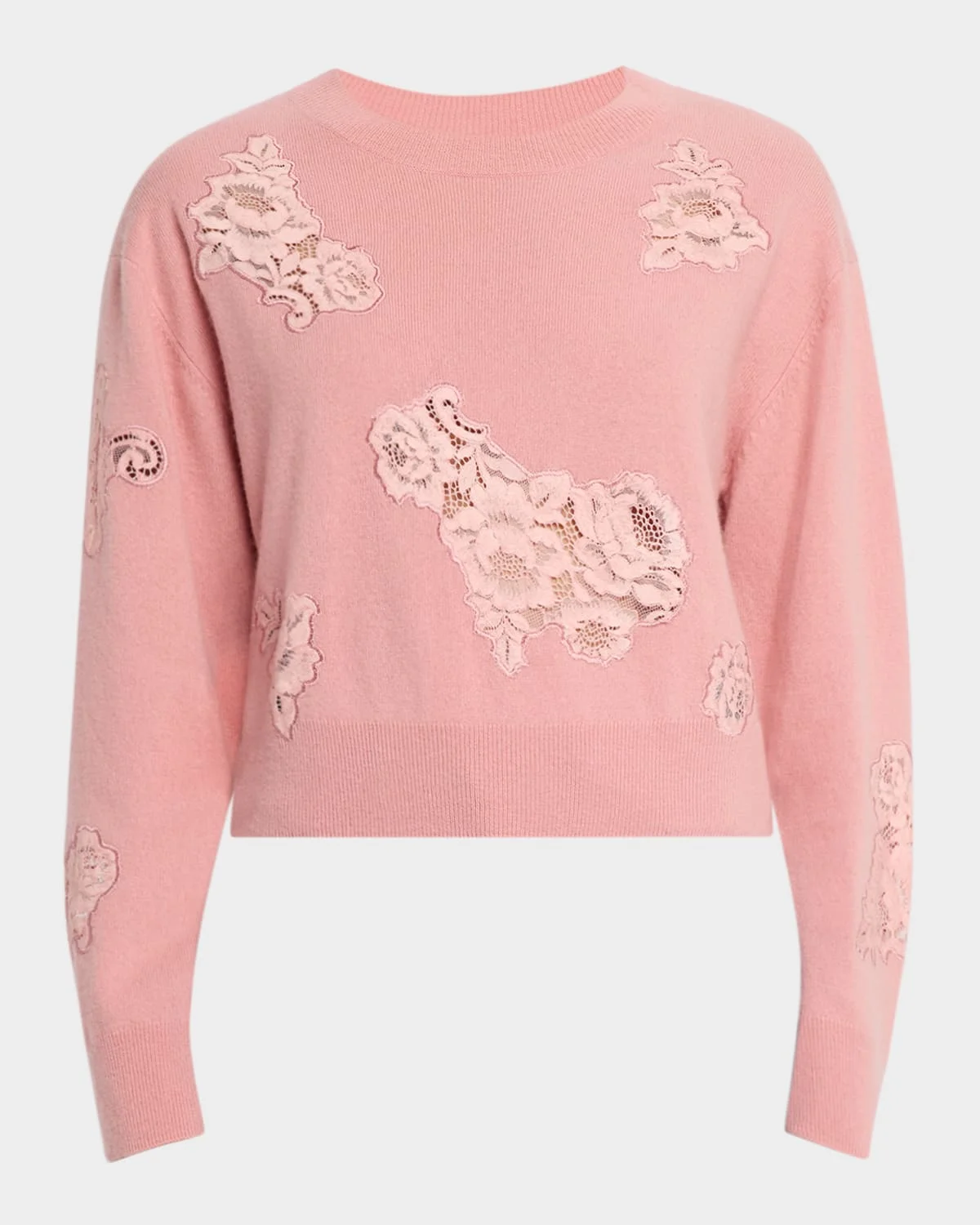 Designed with inset organic lace shapes throughout the body and sleeves, the "Lazuli" sweater by LoveShackFancy offers delicate cutaways that reveal subtle sheerness for a romantic, airy effect Crew neckline Dropped shoulders Long sleeves; approx. 31"L Relaxed fit Hip length Pullover style Cashmere/wool Dry clean only Imported