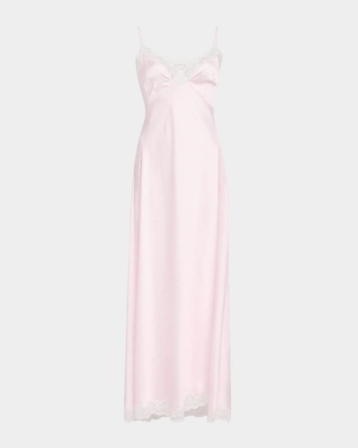 LoveShackFancy "Manuela" biascut dress crafted from a slinky fabrication in a polka dot print with lace detail V neckline Sleeveless Hem falls below the knee Slipover style Polyester Imported