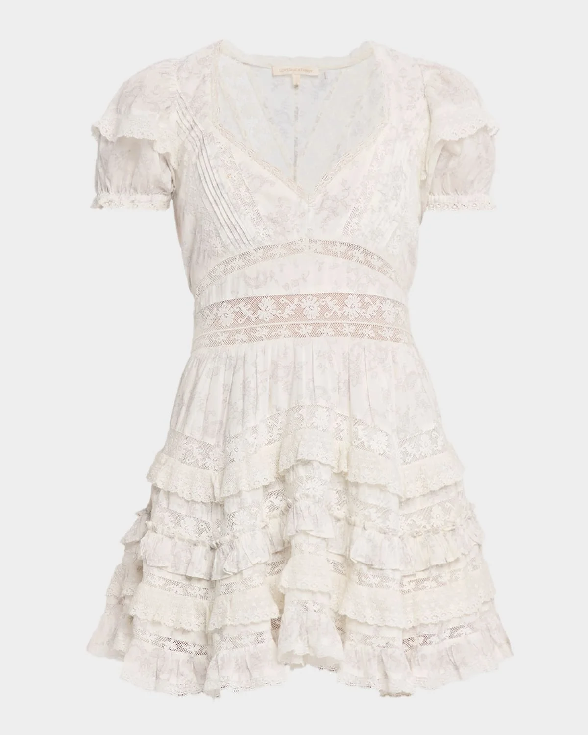 A Victorianinspired design, the "Nivara" dress by LoveShackFancy is crafted from cotton voile with a printed lace effect and intricate vintageinspired lace striping V neckline Short puff sleeves with ruffled tiers Hem falls above the knee Fitandflare silhouette Smocked back panel for an easy slipover style Cotton Lining: Cotton Hand wash cold and lay flat to dry or dry clean Imported
