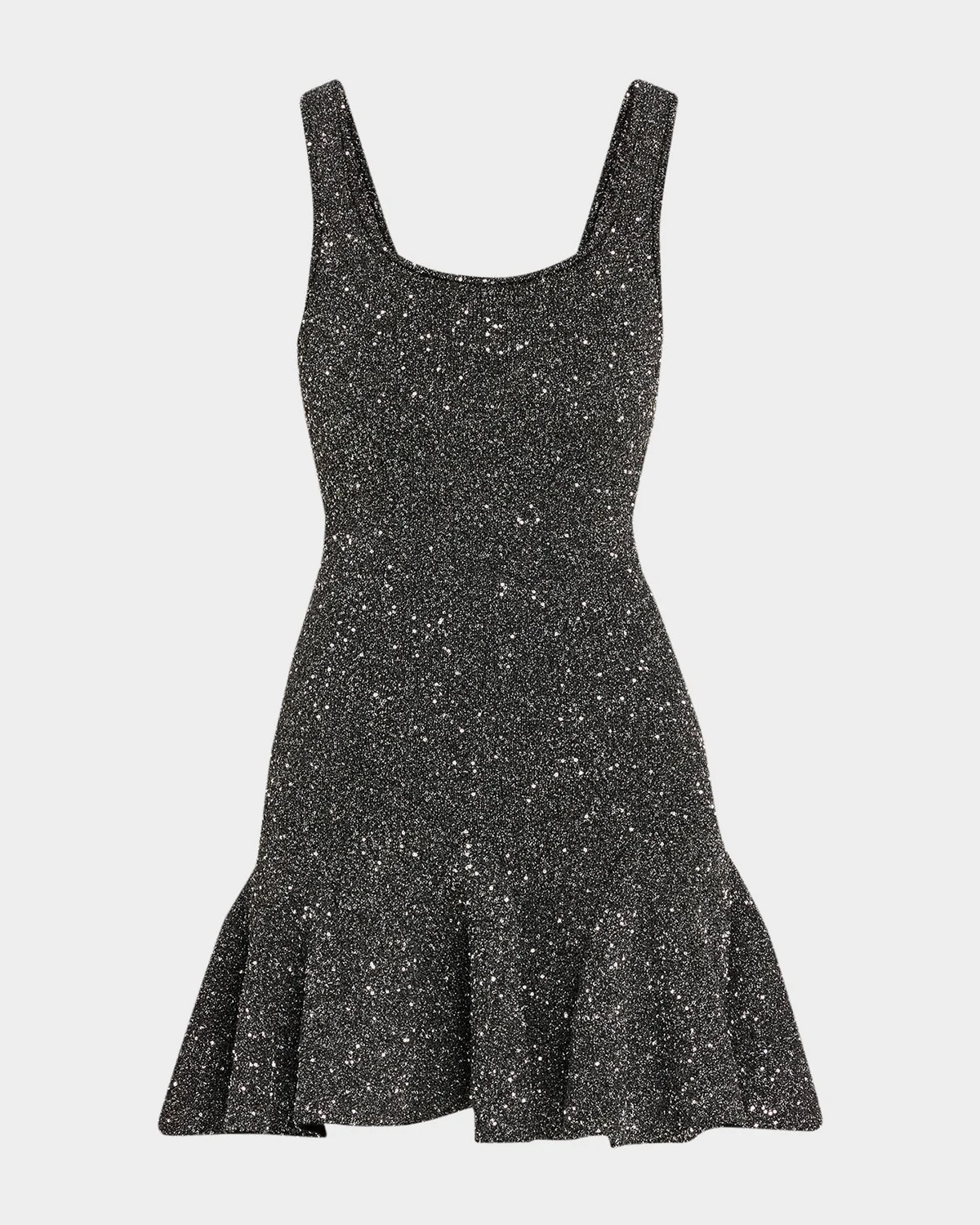 Knit from a soft, stretchy fabric, the "Sarajane" dress by LoveShackFancy is finished with shimmering sequins and godet paneling through the skirt Scoop neckline Sleeveless Hem falls above the knee Fitandflare silhouette Slipover style Recycled polyester/metallic/viscose/polyester Dry clean Imported