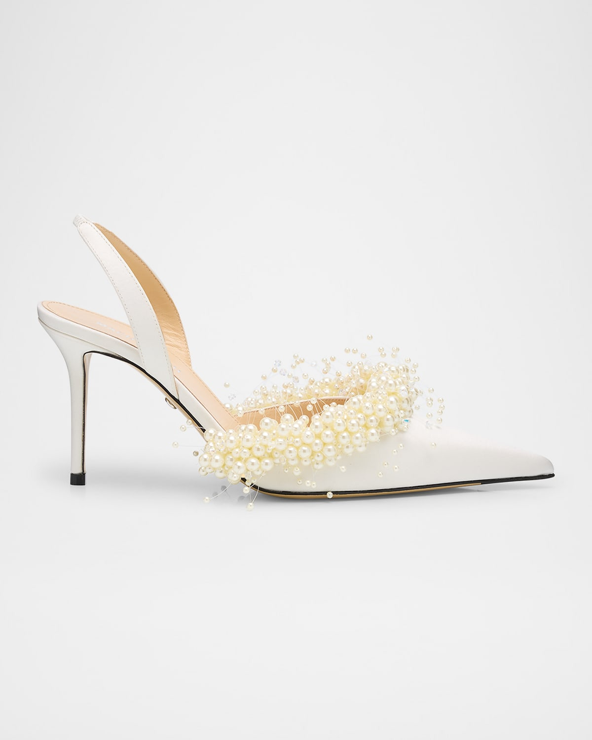 - MACH & MACH crepe satin pumps accented with floating faux pearl accents - 3.25 in / 85 mm stiletto heel - Pointed toe - Elastic slingback strap - Leather outsole - Lining: Goat leather/leather - Made in Italy