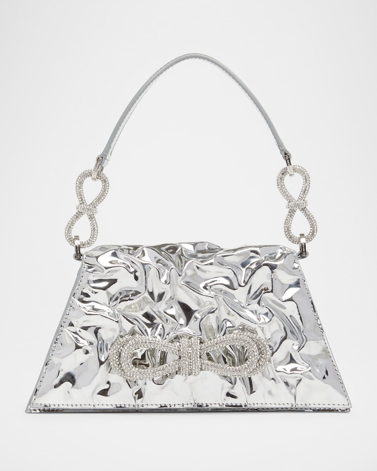 - MACH & MACH "Samantha" top handle bag in scrunched mirror leather with double embellished bow - Flat top handle with bow-embellished accent - Detachable, adjustable crossbody strap - Can be worn as a top handle or shoulder/crossbody bag - Flap top with magnetic closure - Interior, one slip pocket - Approx. 4.5"H x 9.4"W x 2.3"D - Lining: Leather - Made in Italy