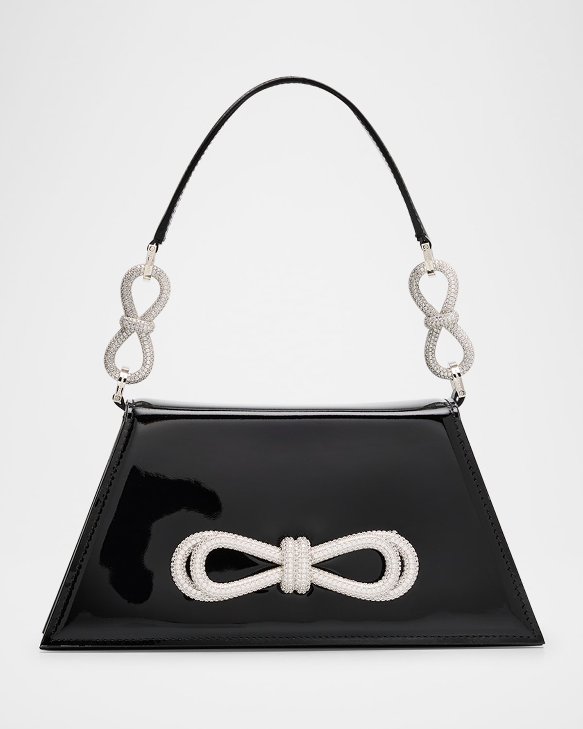 - Glossy patent leather elevates the angular shape of this "Samantha" shoulder bag from MACH & MACH, finely decorated with crystal-studded double bow accents for an added glamorous touch - Detachable flat shoulder strap - Can be worn as a clutch or shoulder bag - Flap top with magnetic closures - Interior, one card slot - Cotton and leather lining - Approx. 4.7"H x 9.4"W x 3.1"D - Made in Italy