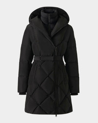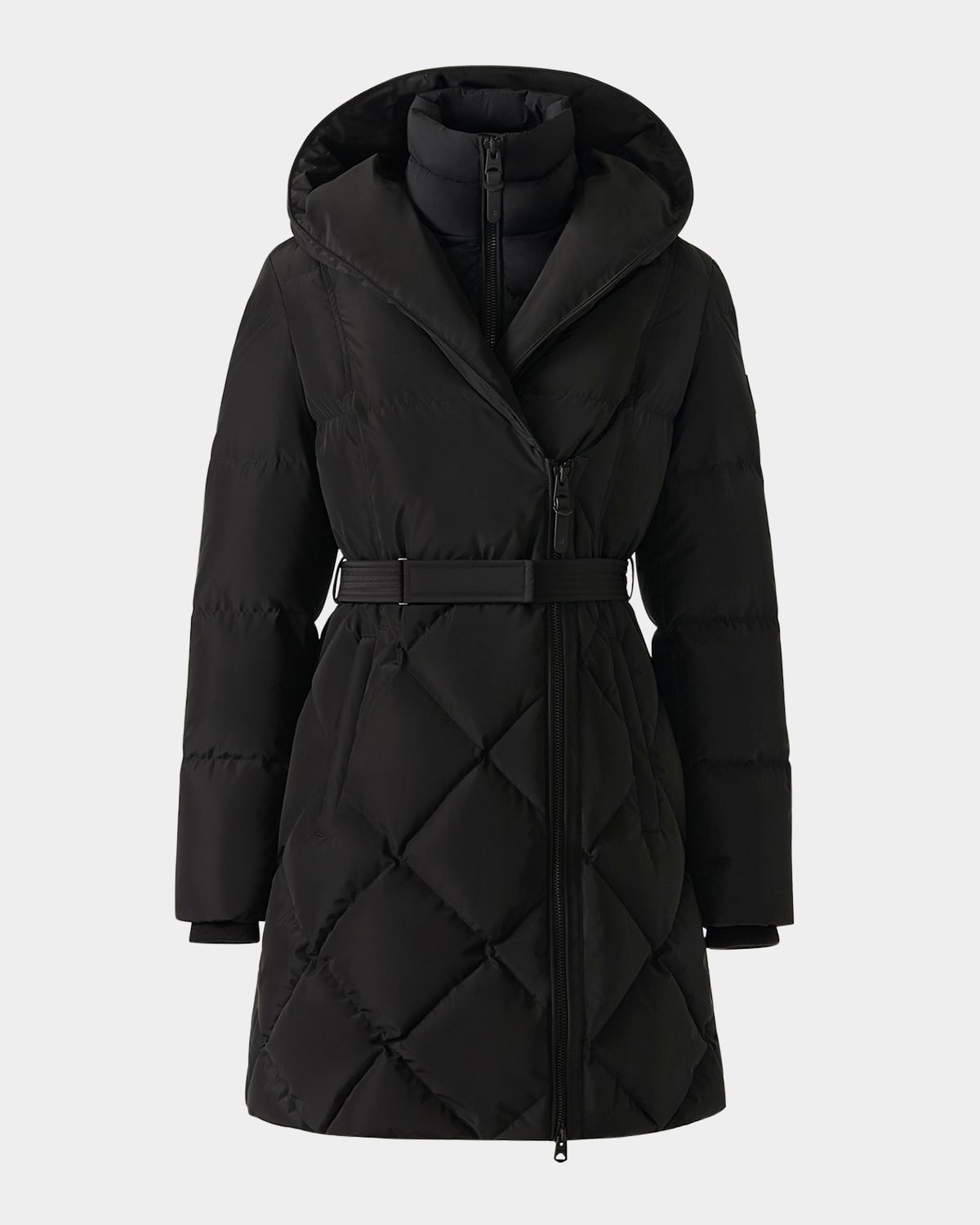 Crafted from waterresistant recycled materials, the "Ayumi" coat by Mackage features a removable down bib and diamondquilting throughout for a refined look with versatile styling that will keep you warm all winter long. Hooded shawl collar Long sleeves with ribknit storm cuffs Signature silicone branding on the left sleeve Adjustable belt Side zip pockets Classic fit Midthigh length Asymmetric zipfront Polyester/nylon/polyamide/elastane Fill: GRScertified down/feather Lining: Recycled polyester Dry clean Imported
