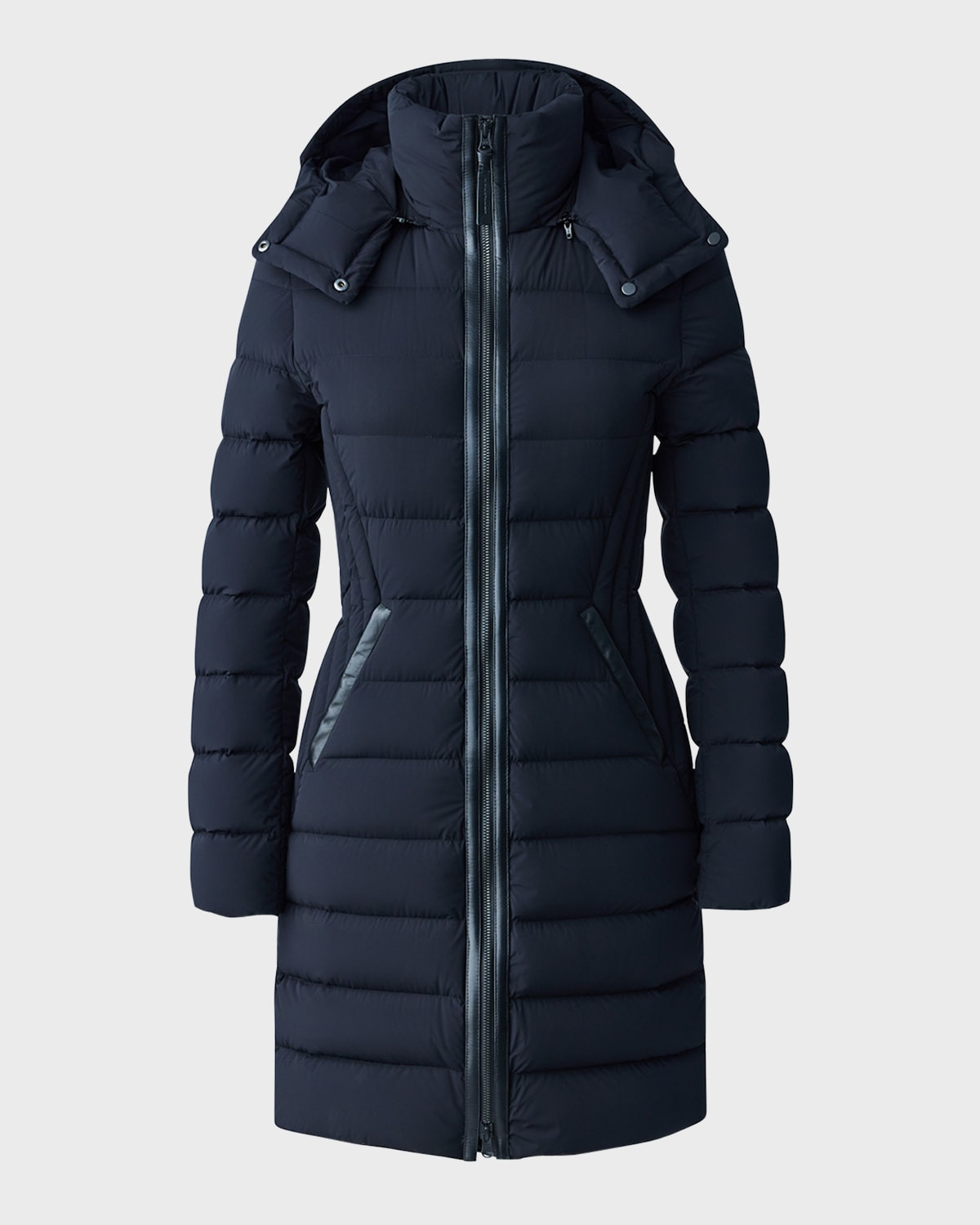 Mackage "Farren" stretch lightweight, quilted coat. Approx. 34.5"L from shoulder to hem. Stand collar; detachable hood. Long sleeves. Twoway zipper. Fitted silhouette. Lower slip pockets. Hem falls above knee. 90/10 goose down/feather fill. Nylon/spandex shell and lining. Calfskin leather trim. Dry clean. Imported.