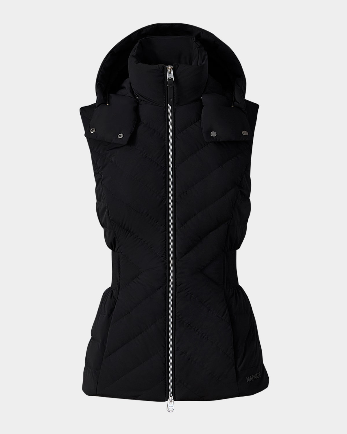 - Warmth without the weight, the "Hoshi" vest by Mackage features down-filled chevron quilting and a defined elasticized waist for shape and comfort. - Water-resistant - Features signature silicone branding on the hem - Stand collar with detachable, drawstring hood - Sleeveless - Slim fit - Hip-length - Two-way zip-front - Eclon® nylon/elastane - Fill: GRS-certified recycled down/feather - Lining: Recycled nylon - Dry clean - Imported