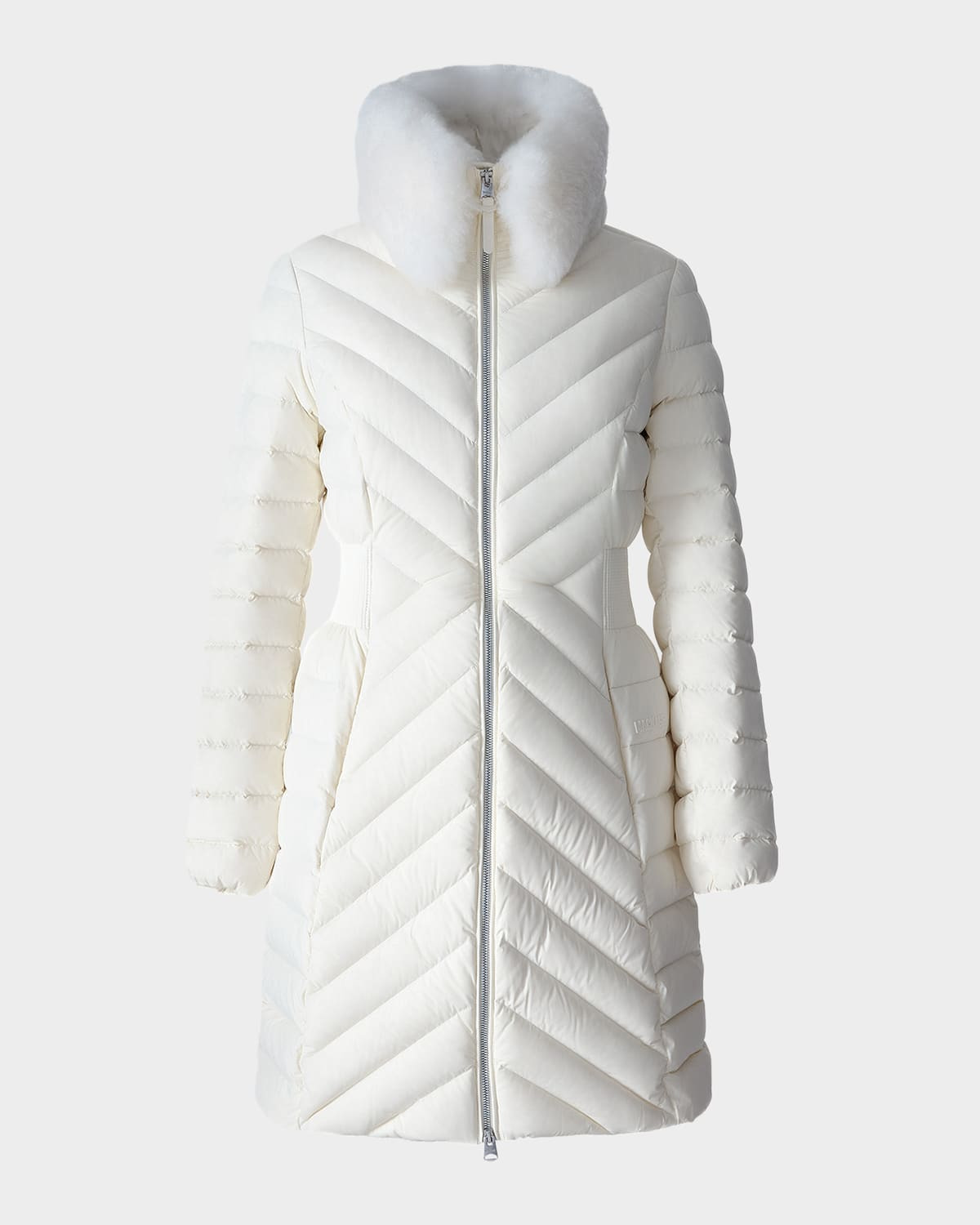 - The "Lyris" chevron-quilted coat by Mackage is crafted from water-resistant, recycled materials and features a luxurious, dyed shearling (China) collar that can be detached for versatile styling. - Stand collar - Long sleeves - Side zip pockets - Fitted silhouette - Cinched waist; silicone brand lettering - Hem falls mid-thigh - Two-way zip-front - Nylon/polyamide/elastane/leather - Fill: Down/feather - Lining: Nylon/recycled nylon - Machine wash - Imported