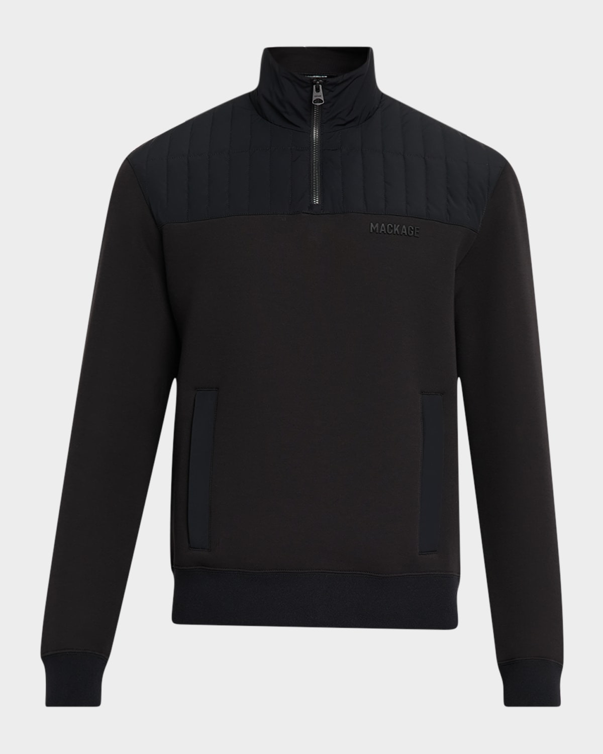 - Mackage "Corey" hybrid sweater crafted from double-face jersey - Vertical-quilted front and back yokes - Stand collar - Quarter-zip closure - Silicone logo on chest - Welt pocket at waist with zipper opening - Rib knit cuffs and hem - Down/feather fill - Cotton/polyester/nylon/polyamide - Machine wash - Imported