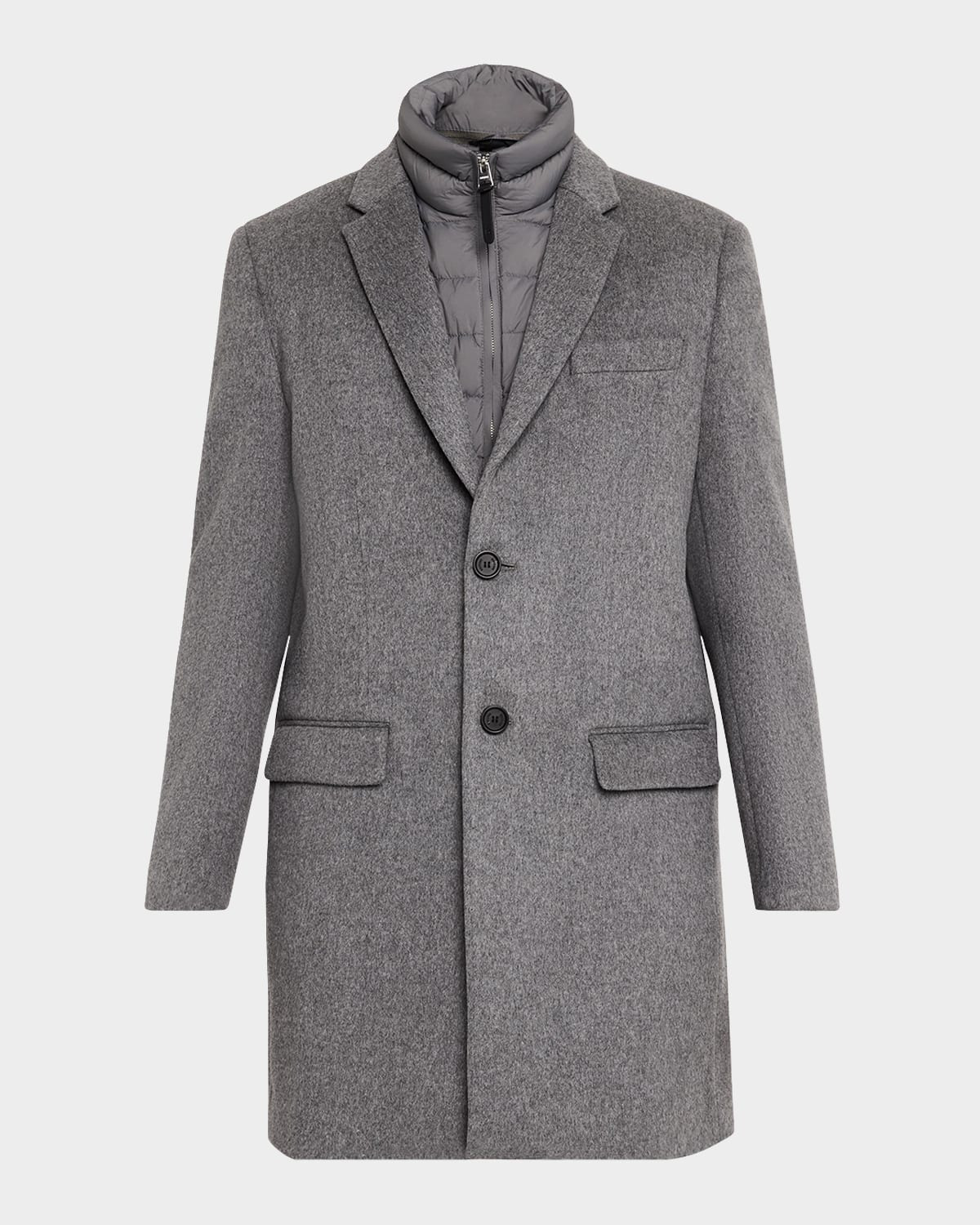 - Mackage topcoat with removable down liner - Center front zipper closure at bib - Single-breasted with two-button closure - Notch lapels - Leather outer collar stand - Chest welt pocket - Hip flap pockets - Inner welt pocket with zipper - Center back vent - Wool - Down/feather fill - Lining: Polyester/recycled nylon/viscose - Dry clean, leather method dry cleaning - Imported - Model is 6'1"/185cm.