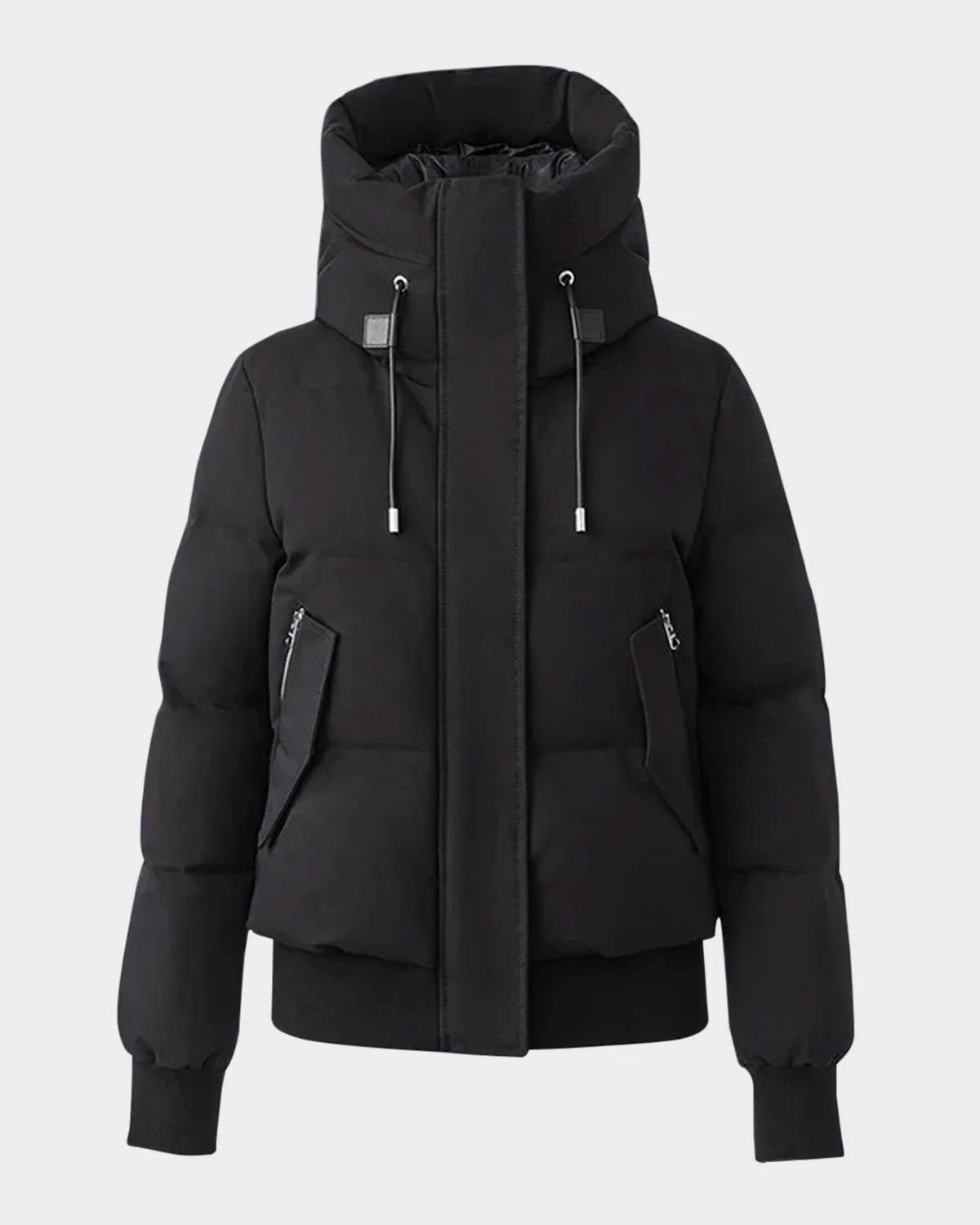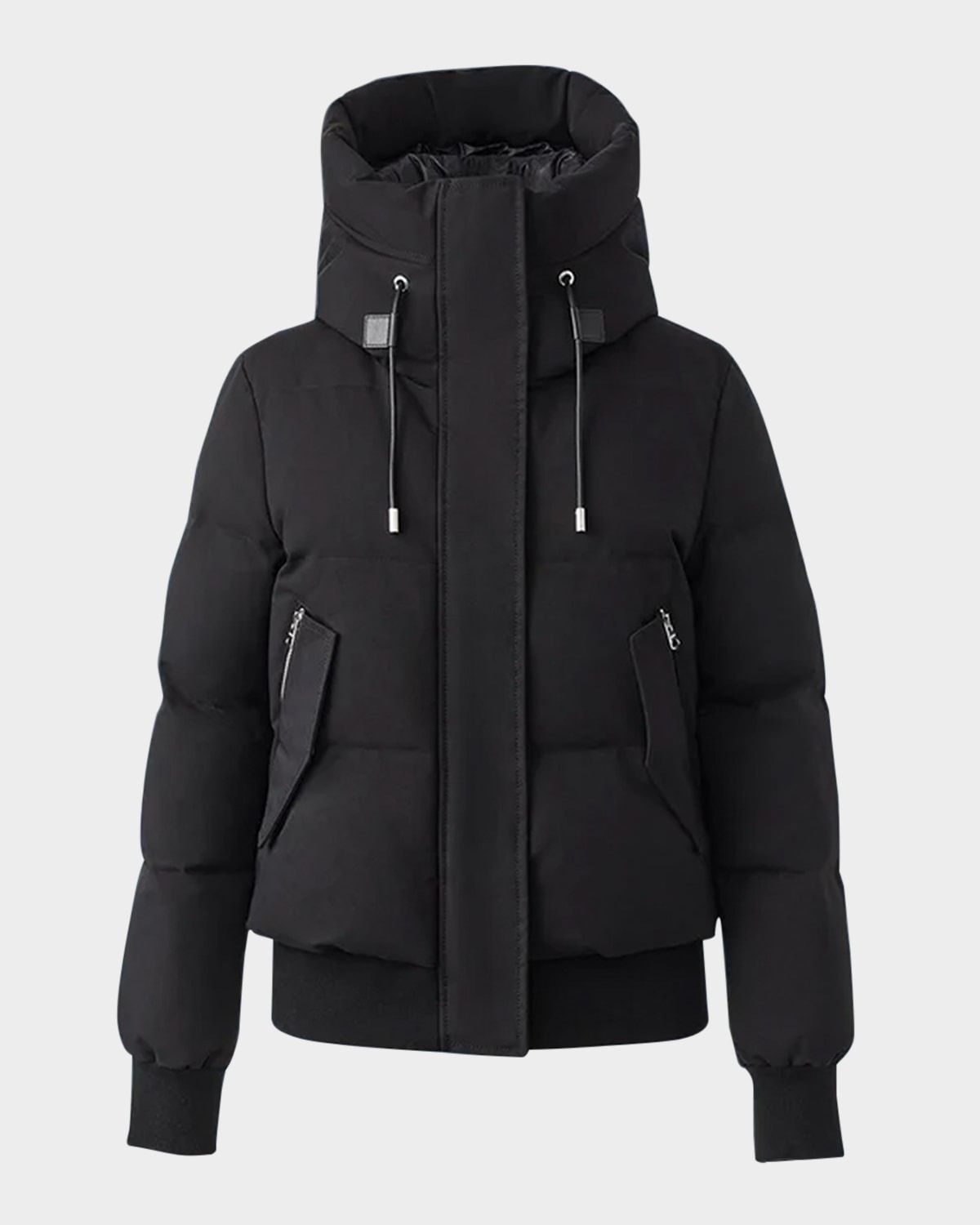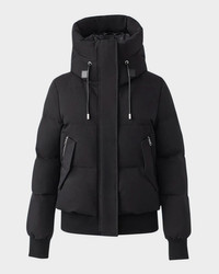 An elevated bomberstyle jacket, the "NefiNFZ" by Mackage features a signature bonded Nordic Tech Shell for harsh temperatures and ribknit trim for functionality without compromising warmth. Features signature silicone branding on the left sleeve Protection down to 20ºC temperatures; waterresistant Detachable, drawcord hooded bib; stand collar Long sleeves with ribknit cuffs Insulated dualentry pockets with zip flap Relaxed fit Ribknit hem Twoway zipfront with snap storm placket Nylon/polyamide/polyester Fill: RDScertified down/feather Lining: Nylon/recycled nylon Dry clean by leather specialist Imported