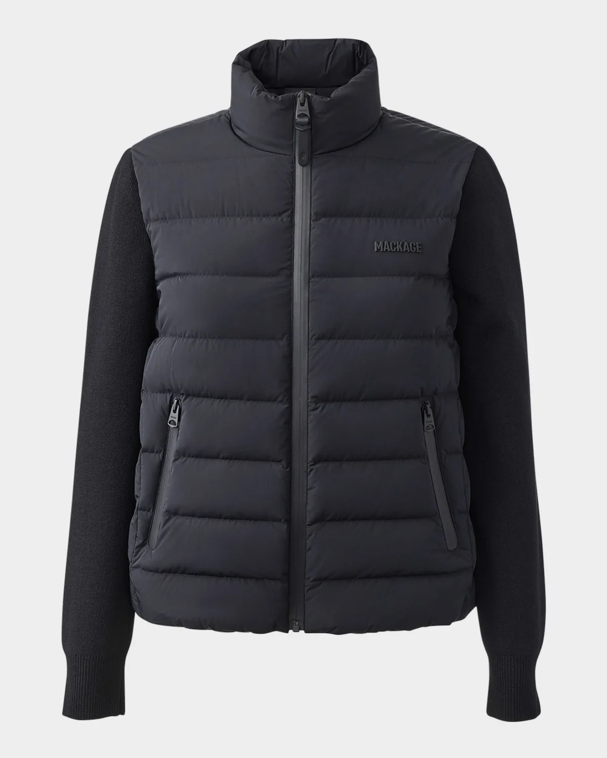- Oceane-City is a mixed-media light-down jacket for women combining the warmth of featherlight recycled down with the comfort of soft knit sleeves. A transitional style with a relaxed fit, flaunting a recycled channel quilt shell and a stand collar. The hem features an adjustable drawcord while invisible zip pockets offer ample storage. A function-focused essential layer designed for utilitarian comfort. - Mackage "Oceane-City" mixed-media jacket crafted from recycled materials with a quilted down bodice - Stand collar - Knit long sleeves with ribbed cuffs - Tonal chest logo - Side zip pockets - Relaxed fit - Adjustable drawcord hem - Zip-front - Amni® nylon/elastane/wool - Fill: Down/feather - Lining: Elastane/nylon/spandex - Dry clean or machine wash - Imported