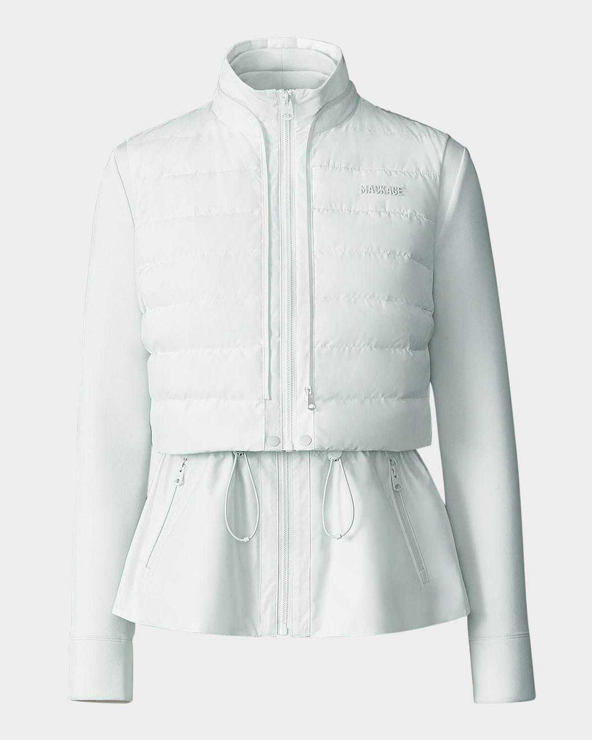 - Priscilla is a 3-in-1 mixed-media jacket for women featuring a rainwear peplum and recycled lustrous light down the front. An expertly tailored indoor-outdoor style, soft double-face jersey accents the sleeves, back, and collar. Perfect for every day, the drawcord waist lends a custom fit and cinched silhouette. Remove the down vest layer for a lighter shell jacket. - Mackage "Priscilla" 3-in-1 hybrid jacket crafted from recycled materials - Removable quilted down vest; zips connect layers - Stand collar - Long sleeves with banded cuffs - Tonal silicone logo at chest - Adjustable drawcord waist (inner layer) - Zip pockets (inner layer) - Adjustable fit - Peplum hem - Zip-front - Cotton/polyester - Fill: Down/feather - Lining: Polyester - Dry clean or machine wash - Imported