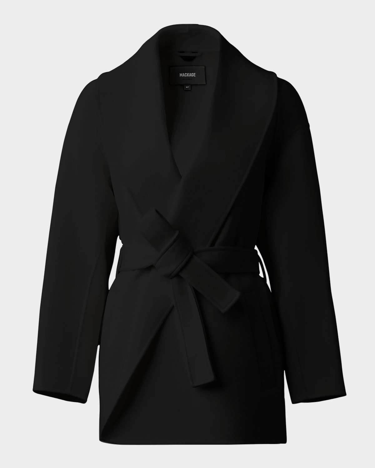 - Mackage "Tyra" double-face wool robe jacket with a sustainable leather and wool sash belt - Approx. 30"L from shoulder to hem - Shawl collar - Wrap front - Long sleeves - Side slip pockets - Tie-belted waist - Back vent - Mid-length - Relaxed fit - Wool/leather - Unlined - Imported - Fashioned for change: responsible manufacturing. Find out more - here - Size Note: Item runs large, consider ordering a size down.