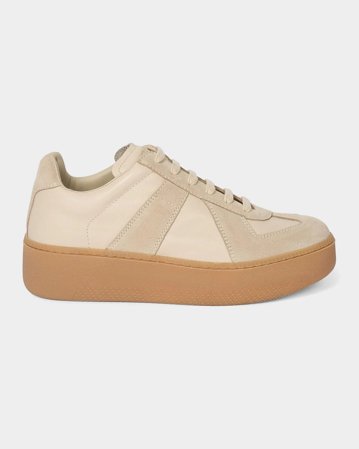The "Replica" platform sneakers from Maison Margiela are crafted of leather with suede accents 1.50 in / 40 mm platform heel Round toe Lace-up vamp Cotton/leather lining Cushioned insole Rubber sole Made in Italy