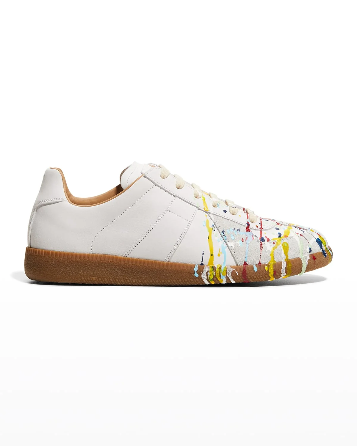 Maison Margiela "Replica" low-top sneakers in calf leather with paint-splatter effect. Flat heel. Round toe. Lace-up vamp. Leather lining. Rubber sole. Maison Margiela signature white stitched label detail on heel counter. Made in Italy.