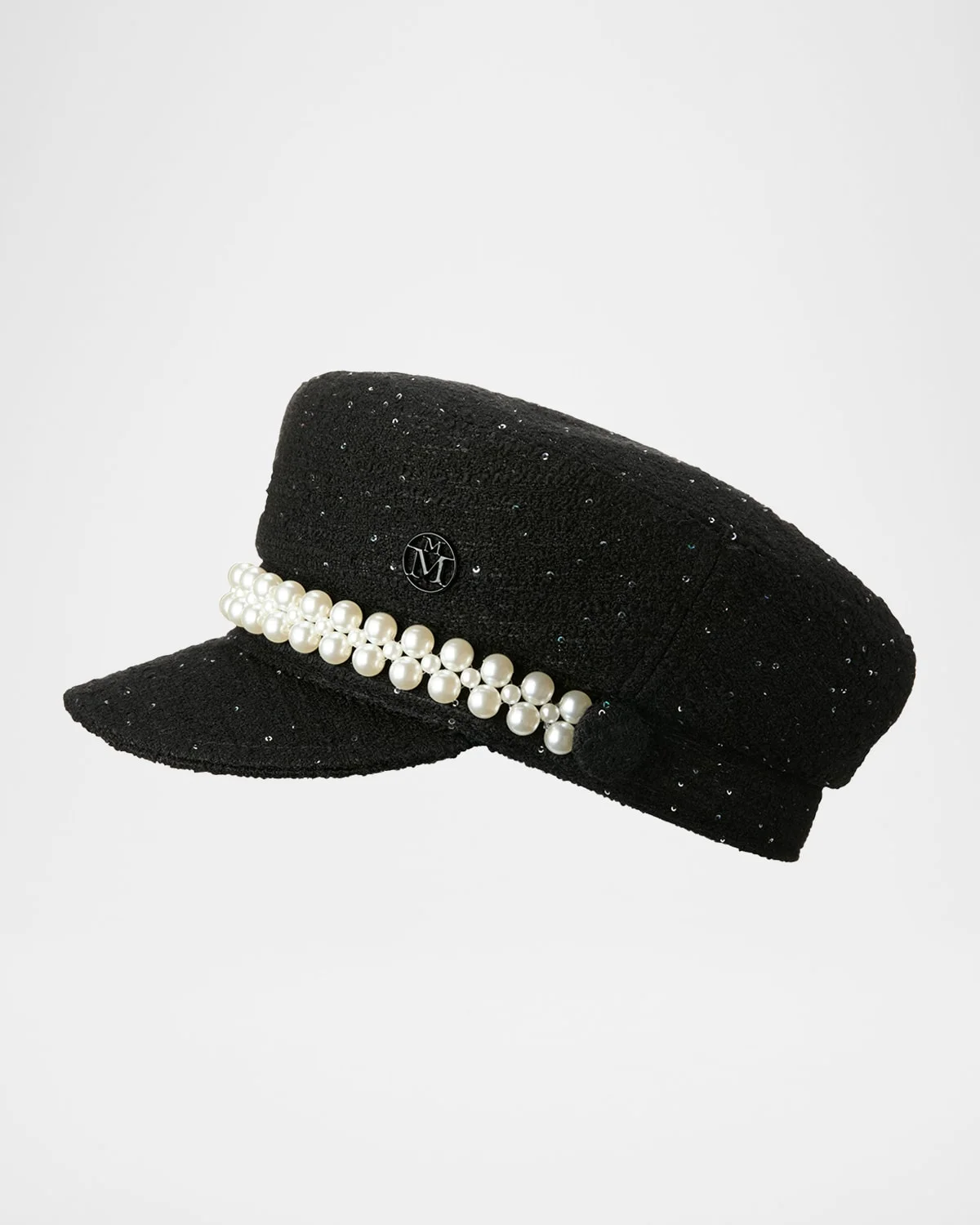 - Maison Michel "Abby" tweed newsboy hat embellished with sequins and a row of faux pearls. - Round paneled crown - Short brim - Metal logo plate - Item Weight (Lbs.): 0.4 - Polyester/acrylic/nylon/polyamide - Spot clean - Made in France