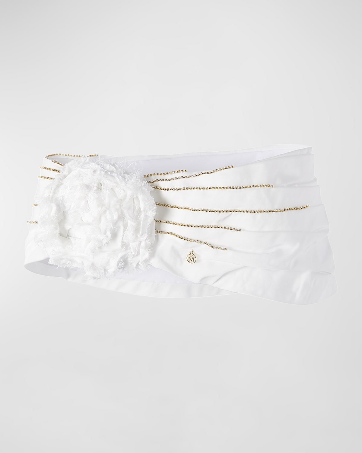Maison Michel "Hiromi" bridal headband in strass, brass, polyester, and polyamide Features a flower accent Approx. 2.7"L x 8.7"W Monogram charm One size fits most Made in France