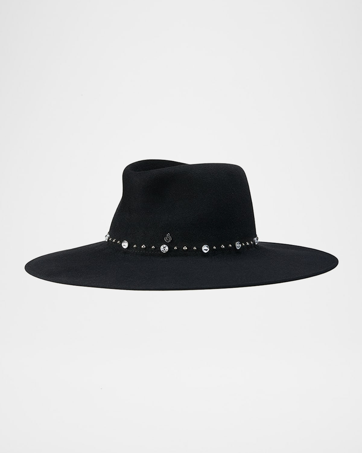 - Maison Michel "Roy" wool felt fedora embellished with rock studs and signature logo plate - Pinched crown - Wide brim - Wool/ABS/polyester - Spot clean - Made in Italy