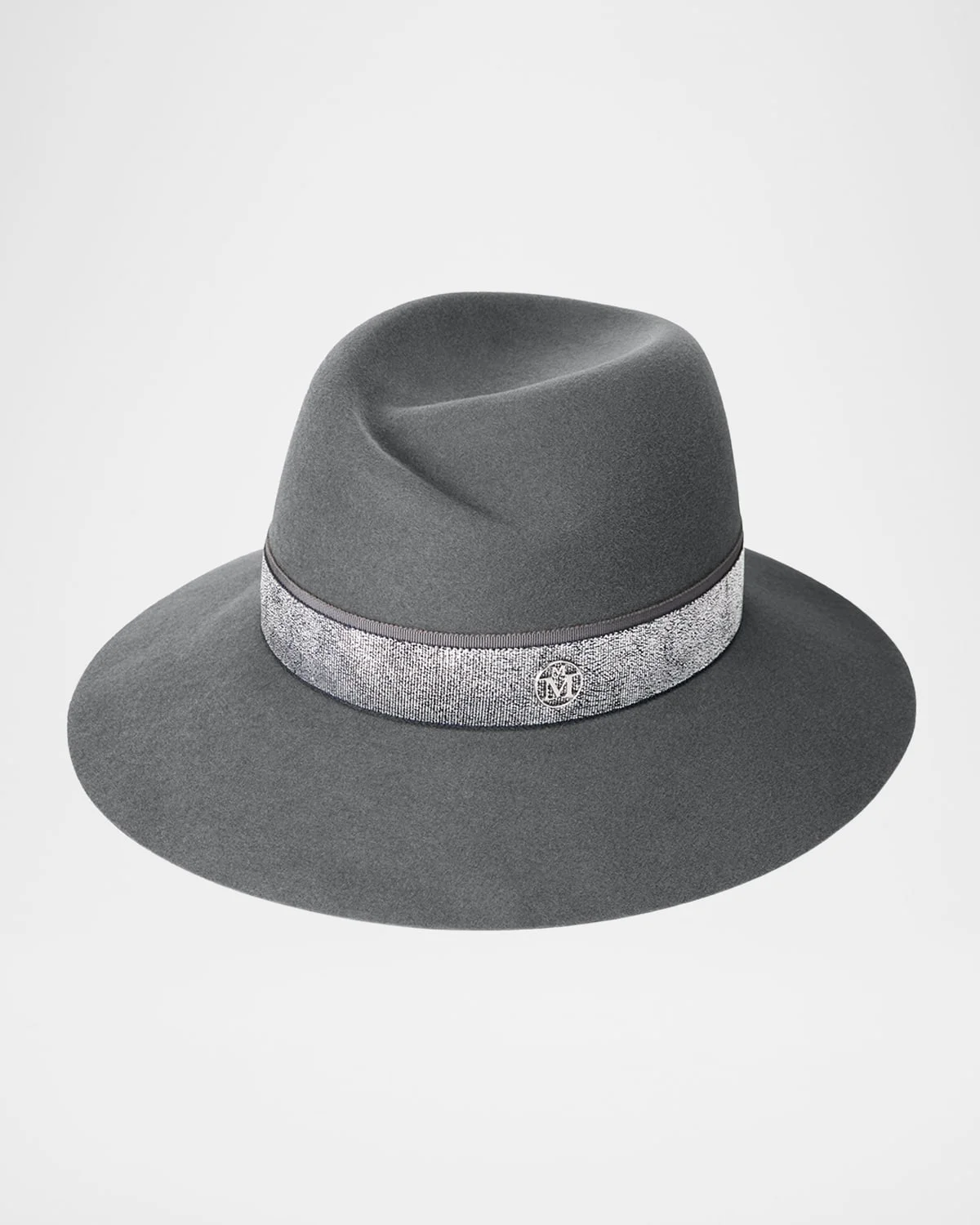 - Maison Michel "Virginie" wool felt fedora embellished with a shimmery tonal ribbon - Pinched crown - Wide flat brim - Silvertone metal logo - Item Weight (Lbs.): 0.4 - Wool/cotton/viscose - Spot clean - Made in France