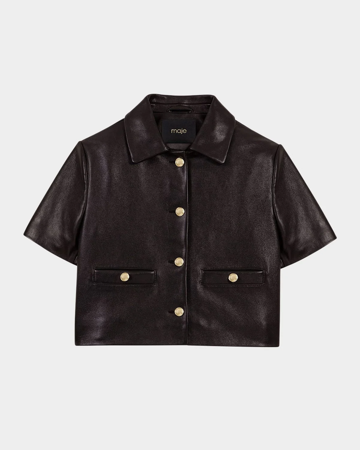 - Maje "Valdom" smooth leather blazer with golden embossed-dome buttons - Spread collar - Short sleeves - Front buttoned welt pockets - Hip length - Relaxed fit - Button front closure - Leather - Lining: Polyester - Dry clean - Imported