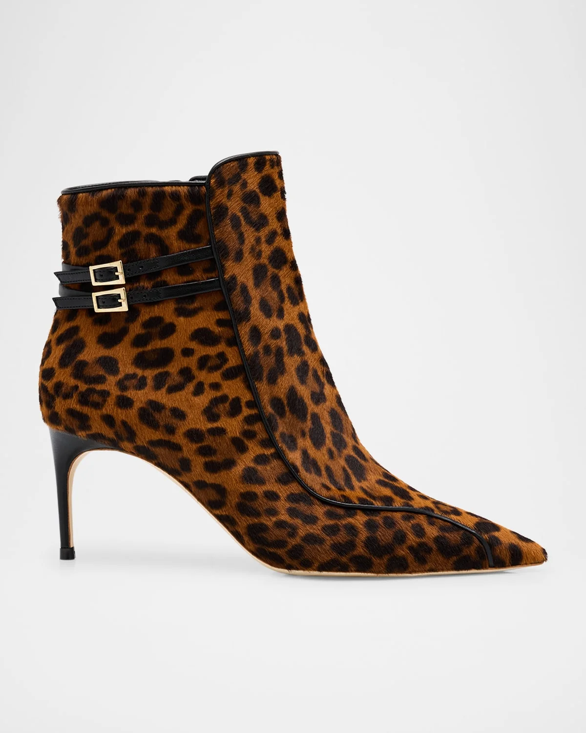 Accented with smooth leather buckle straps and trim, the Giordana booties by Malone Souliers are crafted from leopardprinted dyed calf hair (Italy) 2.75 in / 70 mm covered stiletto heel Pointed toe Side zip eases dress Made in Italy