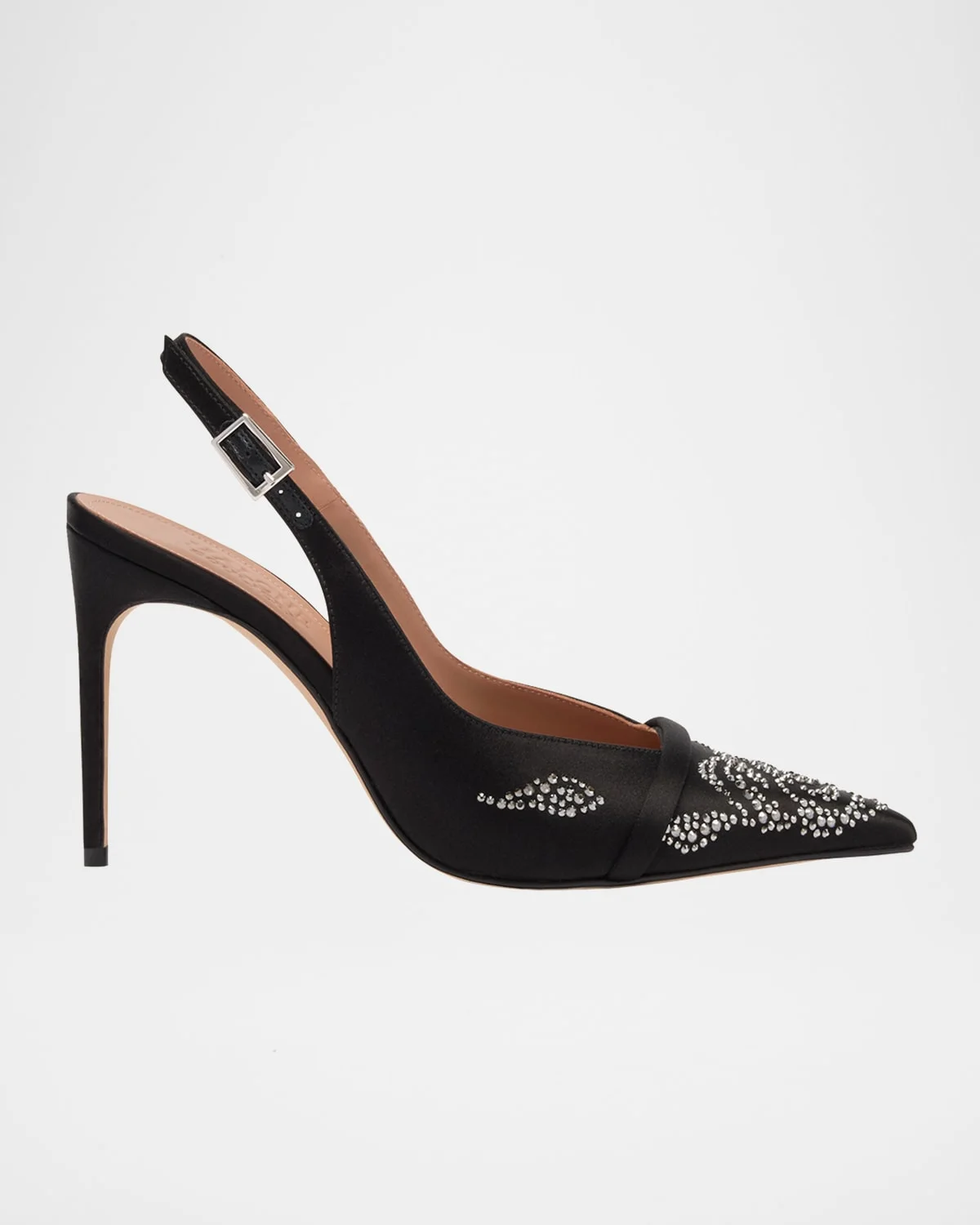 Malone Souliers "Jazz" crystalembellished satin pumps 3.50 in / 90 mm covered stiletto heel Pointed toe Buckle slingback strap Leather outsole Wipe clean Made in Italy