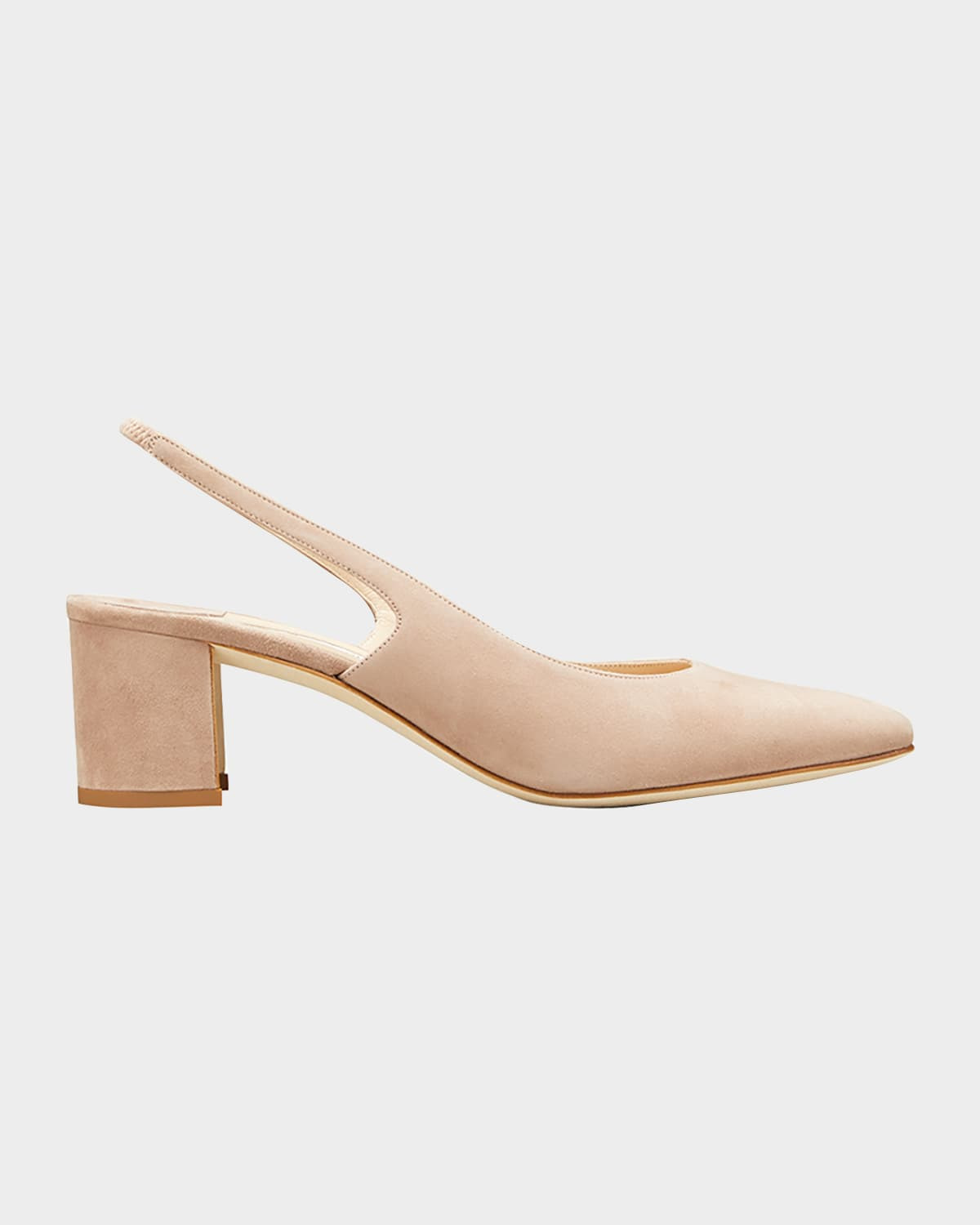 - Manolo Blahnik 50mm "Allurasa" pump in suede. - 2" covered block heel. - Almond toe. - Halter slingback with stretch inset. - Leather lining and outsole. - Made in Italy. Heel height may vary by size.