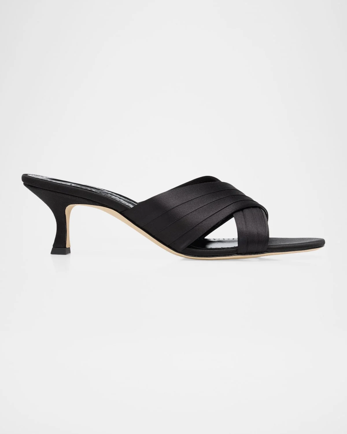 The "Vieramul" satin mule sandal by Manolo Blahnik features pleated straps that add texture and visual interest to the shoe. 2.00 in / 50 mm kitten heel Open toe Crisscross vamp Slip-on style Viscose upper Leather lining and sole Made in Italy