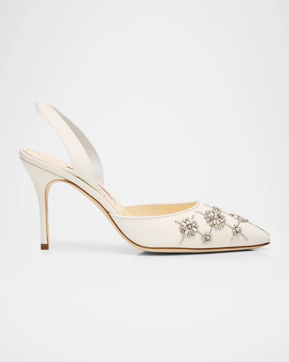 Crafted from lustrous satin, the "Ralyne" pumps by Manolo Blahnik feature a crystalembellished floral design 90 mm covered stiletto heel Pointed toe Elasticized halter strap Silkette® viscose upper Leather lining and outsole Made in Italy