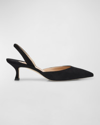 - Manolo Blahnik "Carolyne" kid suede pumps - 2.00 in / 50 mm kitten heel - Pointed toe - Stretch halter slingback - Leather outsole - Lining: Leather - Item runs small, consider ordering a size up - Made in Italy